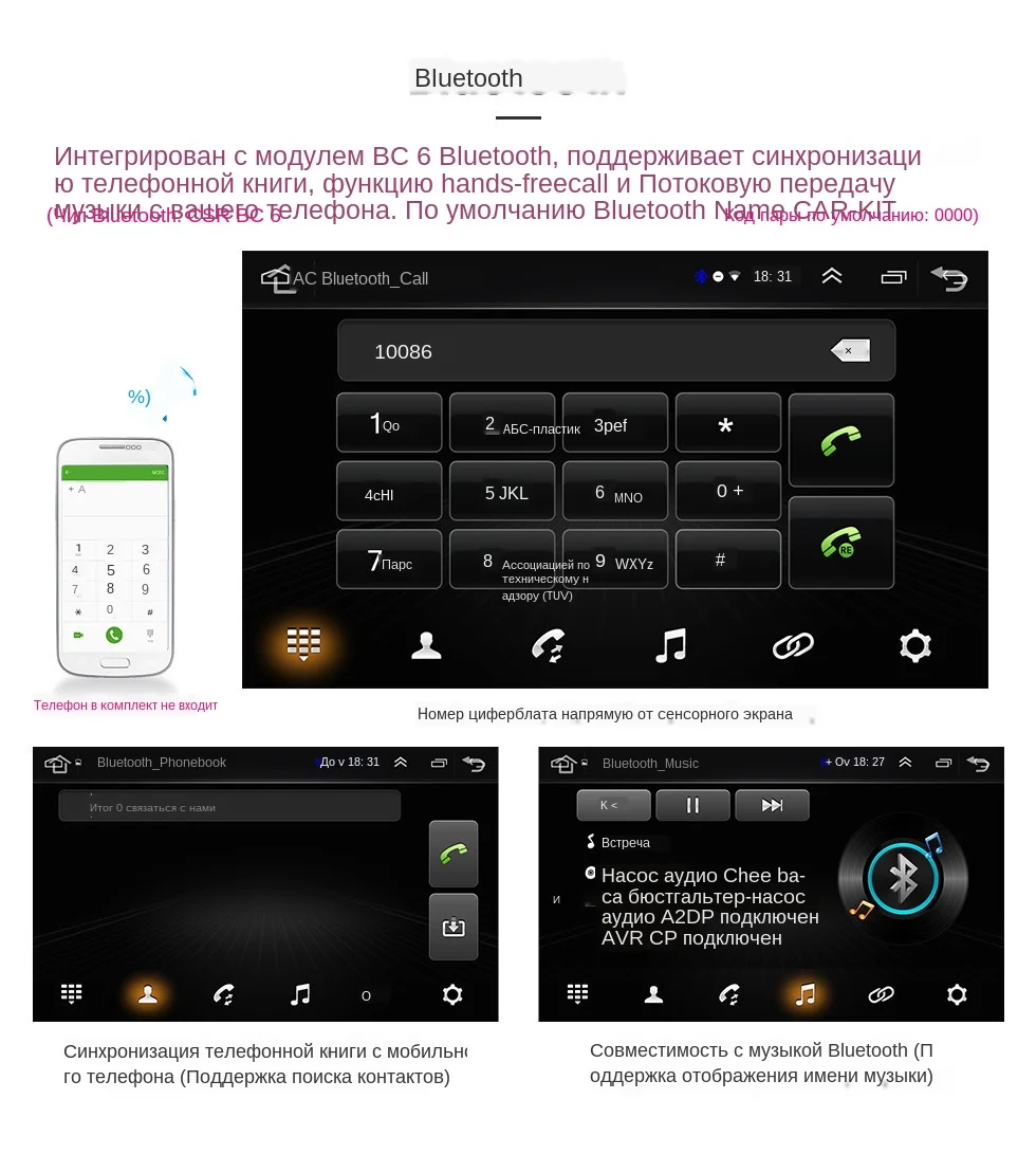 Dvd-плеер:С этим одним dvd-плеером din вы можете воспроизводить CD и DVD диски. Благодаря технологии защиты от ударов и последней памяти вы можете смотреть фильмы или видео в движении. Форматы, такие как DVD/DIVX/MP4/MP3/MP2/VCD, совместимы. HD Цифровое ТВ:DVB-T/ATSC/ISDB-T HD ТВ-тюнер может быть предоставлен для приема цифровых ТВ-каналов. Автомобильный видеорегистратор:Функция DVR используется для записи всего процесса дорожно-транспортных происшествий, фотографирования перед транспортными средствами и хранения видео в режиме реального времени во время вождения. 3G модуль:С этим модулем 3g Вы можете подключиться к интернету 3g, вставив к нему sim-карту. Резервная камера:Он добавляет резервную камеру для автоматического переключения на изображение парковки во время заднего хода. Этот вариант включает в себя водонепроницаемую и камеру ночного видения, которая будет установлена в положение номерного знака вашего автомобиля и кабели для его подключения. Проводная камера заднего вида по умолчанию. Если вам нужен беспроводной, пожалуйста, отправьте нам сообщение после размещения заказа. OBDII:С помощью этого сканера OBDII вы можете подключить его к порту DLC вашего автомобиля и открыть Bluetooth устройства для мониторинга расхода топлива автомобиля, температуры воды, скорости вращения, температуры окружающей среды, давление впуска, положение дроссельной заслонки, поток воздуха, компьютерная нагрузка, скорость автомобиля и т. д. в интерфейсе OBD. DAB:Короткое для цифрового аудио вещания, DAB в качестве передовой цифровой радиотехнологии для вещания радиостанций объединяет ряд функций, чтобы уменьшить проблемы помех и Шум сигнала. С высоким качеством звука, он предлагает больше радиопрограмм по конкретному спектру, чем Аналоговое fm-радио. Кроме того, DAB может не только автоматически настроиться на все доступные станции, предлагая список для вас, но и предоставить информацию в реальном времени, такую как названия песен, тип музыки, новости или обновления трафика. Это лучший выбор для любителей радио и любителей музыки. TPMS:Прекрасно соединенный с этим головным устройством с простой установкой, TPMS сообщает информацию о давлении шин в режиме реального времени с помощью дисплея пиктограммы или простого предупреждающего светильник низкого давления, чтобы помочь вам сэкономить расход топлива, продлить срок службы шин, уменьшить время простоя и техническое обслуживание и повысить экологическую эффективность. Раннее распознавание неисправности шин, предоставленных TPMS, может избежать дорожно-транспортных происшествий, чтобы повысить безопасность во всем процессе вождения.USB ключ Carplay:Совместим с IOS и Android мобильный телефон, этот USB ключ Carplay подключи и работай. Он поддерживает Оригинальное Голосовое управление автомобиля и сенсорный экран. Благодаря ему вы можете свободно наслаждаться функцией carplay вашего смартфона в вашем автомобиле.
