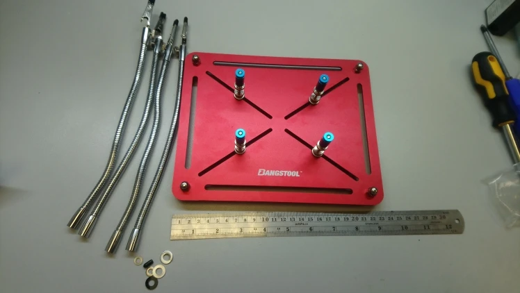 Симпатичная рука. Устойчивое большое основание, что удобно. К сожалению, нет инструкции, поэтому собирать приходиться по фото и самому догадываться, как и что должно крепиться. После сборки остались три большие шайбы: либо три лишние, либо одну не доложили, но собралось все нормально. Держатели крокодилов гнутся хорошо, умеренно жёсткие, так что не прогибаться под паяльником. В некоторых положениях они не остаются в выставленом положении, а начинают немного пружинить и приходится немного помучиться, чтобы точно выставить положение. На крокодилах плата крепится довольно высоко, и чтобы её опустить, приходится делать из гибких держателей петлю. В целом, очень удобная третья рука, мне понравилась.