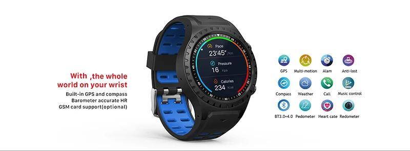 Встроенный gps/мульти-спортивный режим/Будильник/анти-потеря/Компас/Погода/ответ на вызов/управление музыкой/Bluetooth/шагомер/пульс