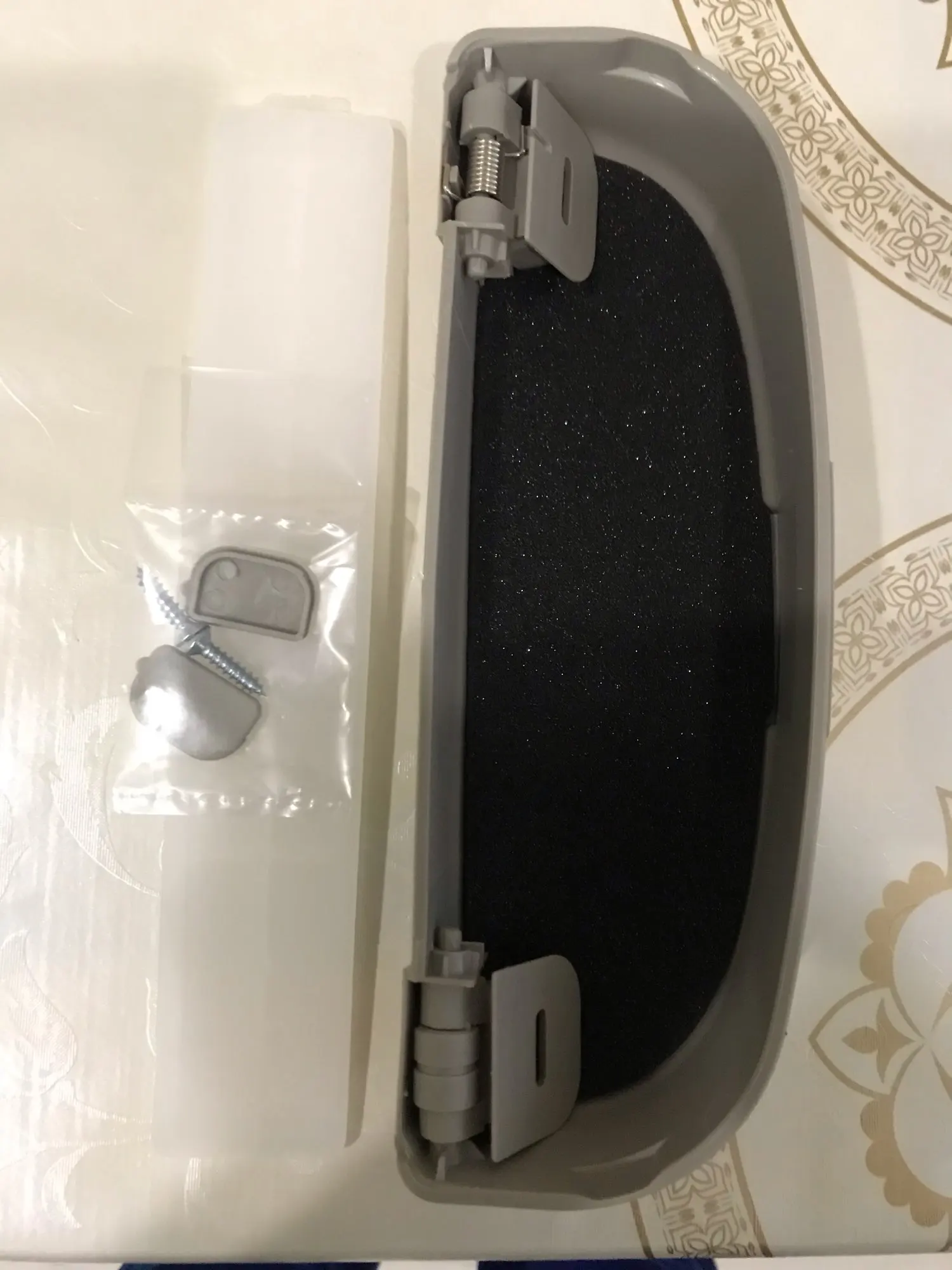 Получил сегодня заказанный очечник. Доставка довольно быстрая, менее трех недель. качество чехла нормальное и серый цвет почти в тон с потолочной обивкой. Только вместо микролифта-обычная пружина и довольно жёсткая, но это не критично... Фото пока не делал, после установки сфотографирую. Продавцу спасибо, я доволен!
