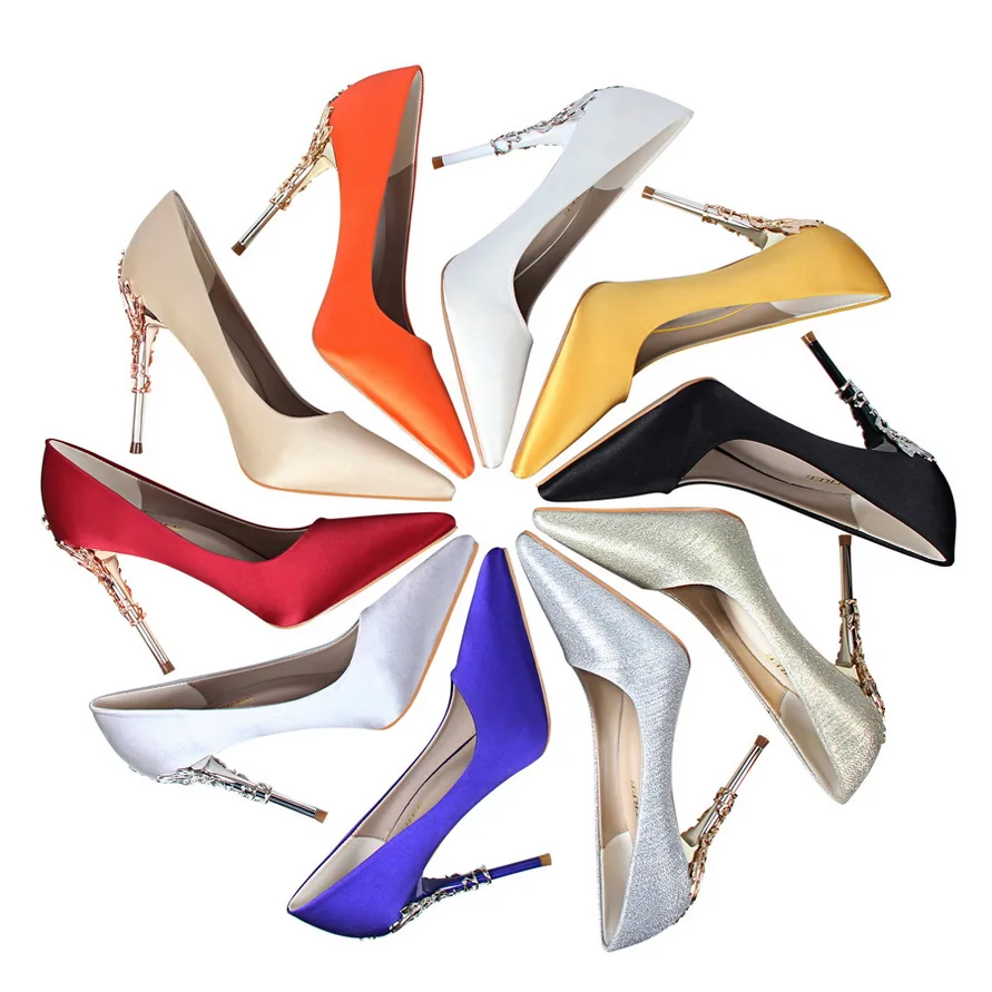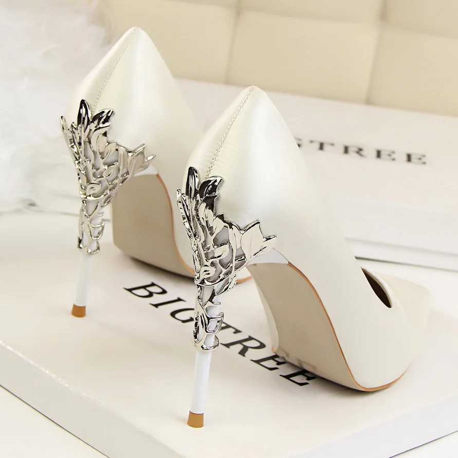 BIGTREEженские туфли-лодочки на металлическом каблуке с резным узором; Однотонные шелковые туфли с острым закрытым носком на высоком каблуке 10 см; Женская обувь; Свадебные туфли; 92192
