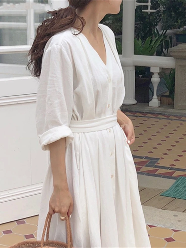Женское плиссированное платье с высокой талией и v-образным вырезом