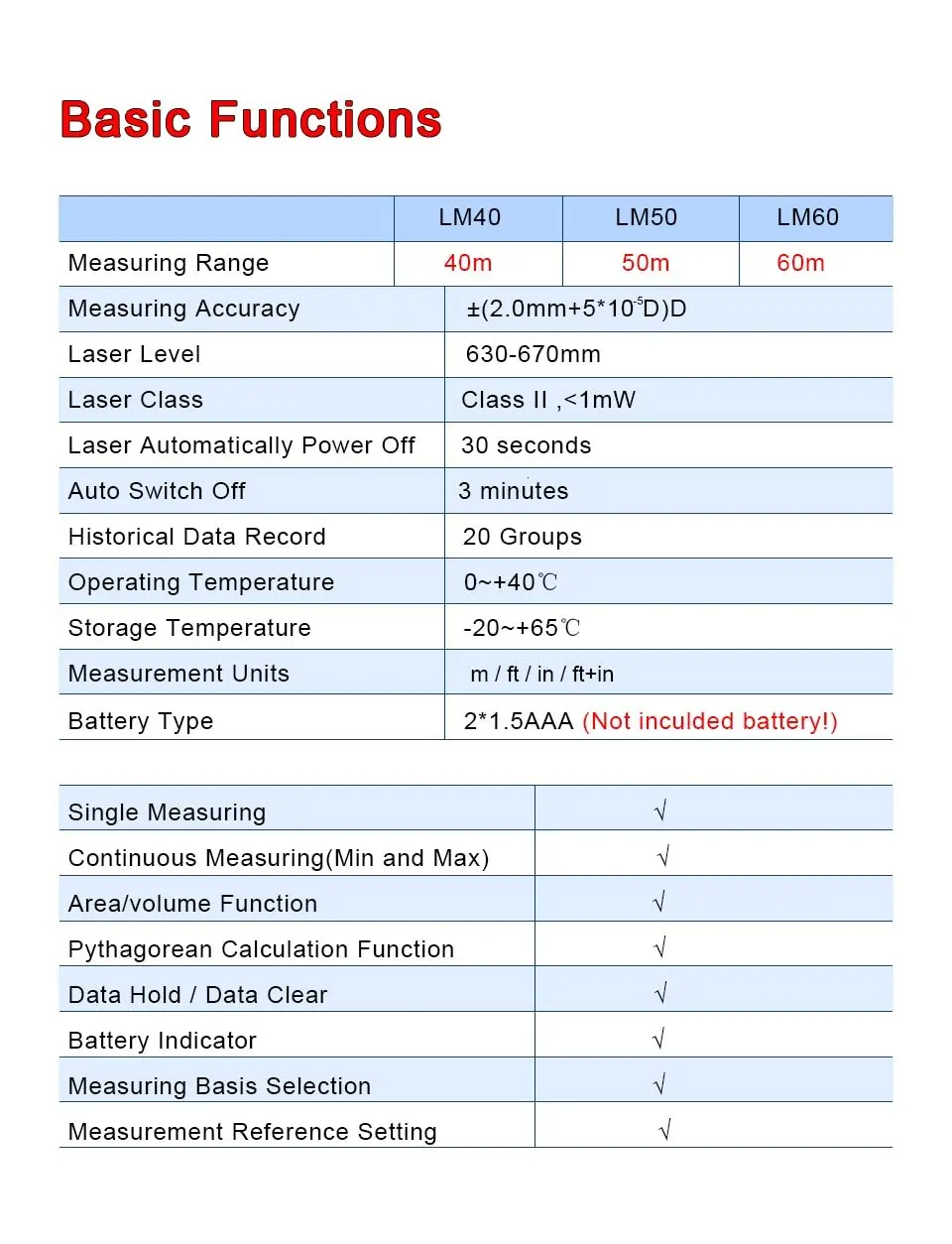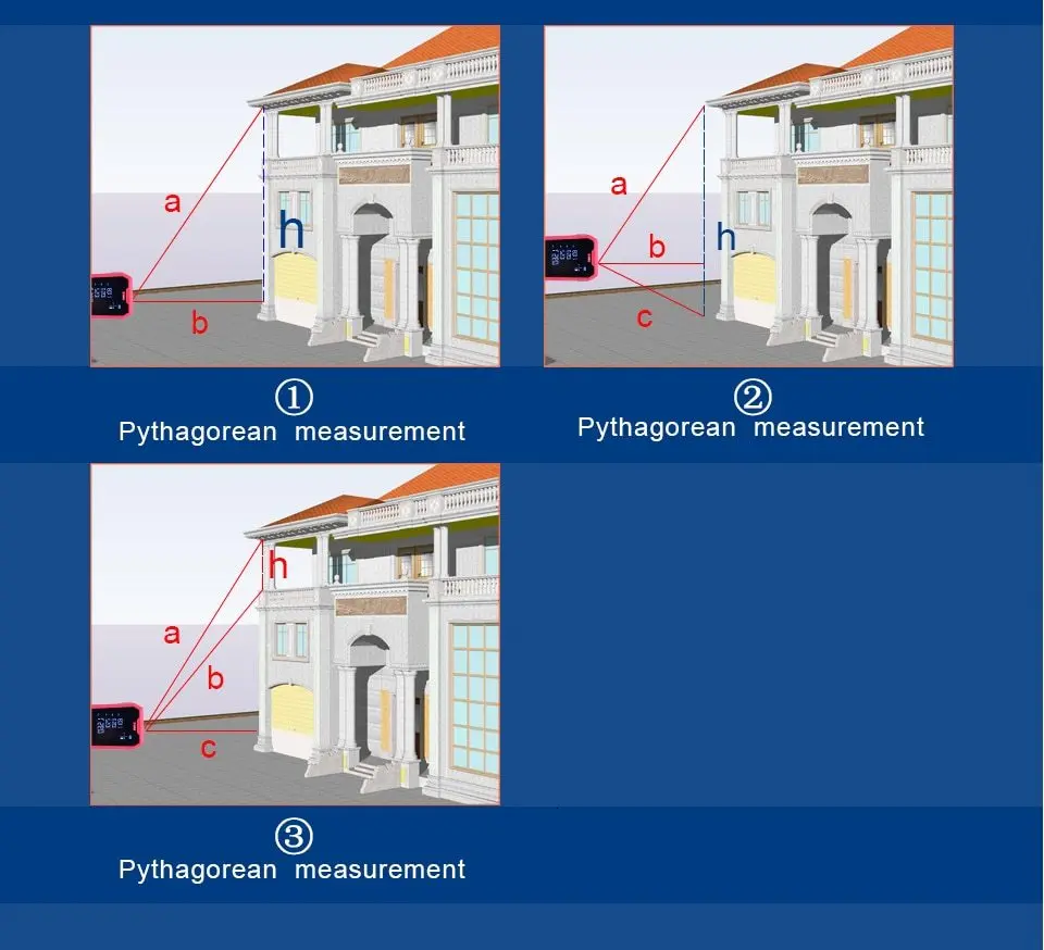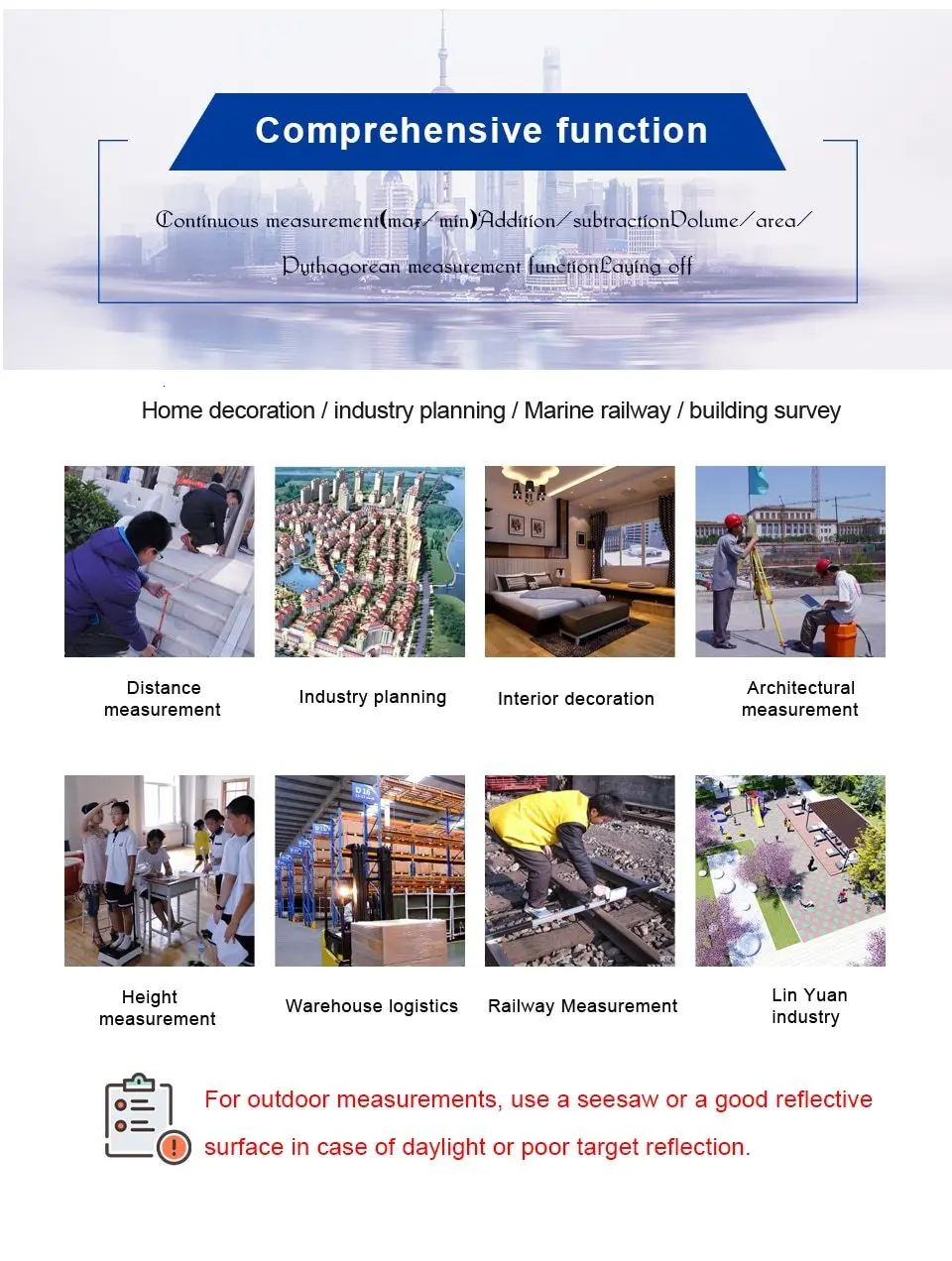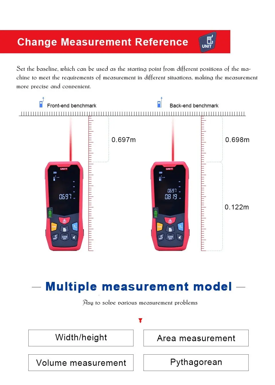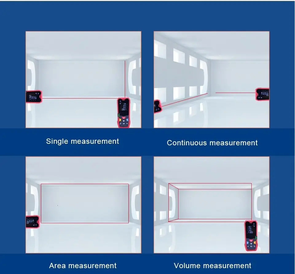 Его дружественная настройка позволяет измерять расстояние, площадь, громкость, пифагору с ЖК-подсветкой для внутренней и наружной среды. Эти устройства являются идеальным портативным, надежным и удобным решением для измерения.