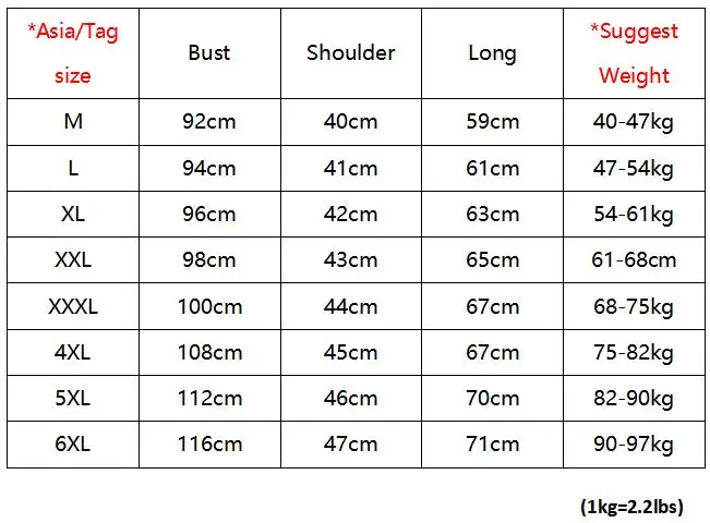 * Азия/размер бирки: это Азиатский Размер, он на 2-3 размера меньше, чем Европейский/американский размер. Если вы носите Европейский/американский размер M, вы можете выбрать наш Размер XL или XXL --- * Не уверены в вашем размере? Не волнуйтесь, просто сообщите нам ваш рост, вес, мы порекомендуем вам подходящие размеры. --- * При измерении вручную допускается погрешность в 1-3 см (1 см = 0,39 дюйма). ---