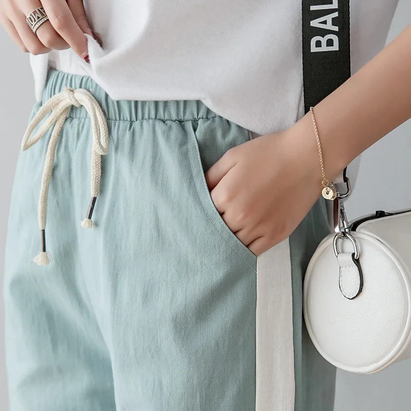 Русская модная леди Женский по щиколотку брюки хлопок льняные шаровары брюки эластичный пояс весенне-летние брюки повседневные Боковые Полосатые брюки-карандаш черные