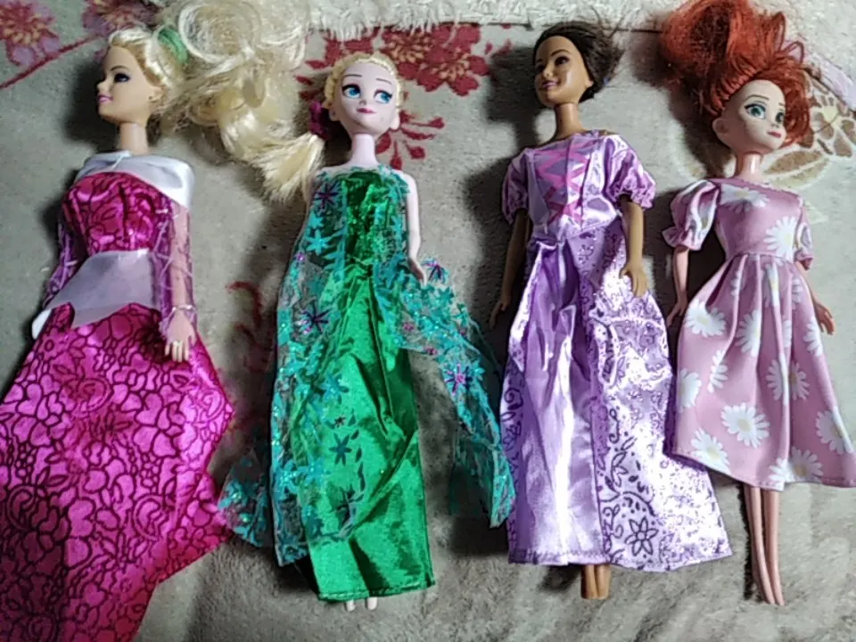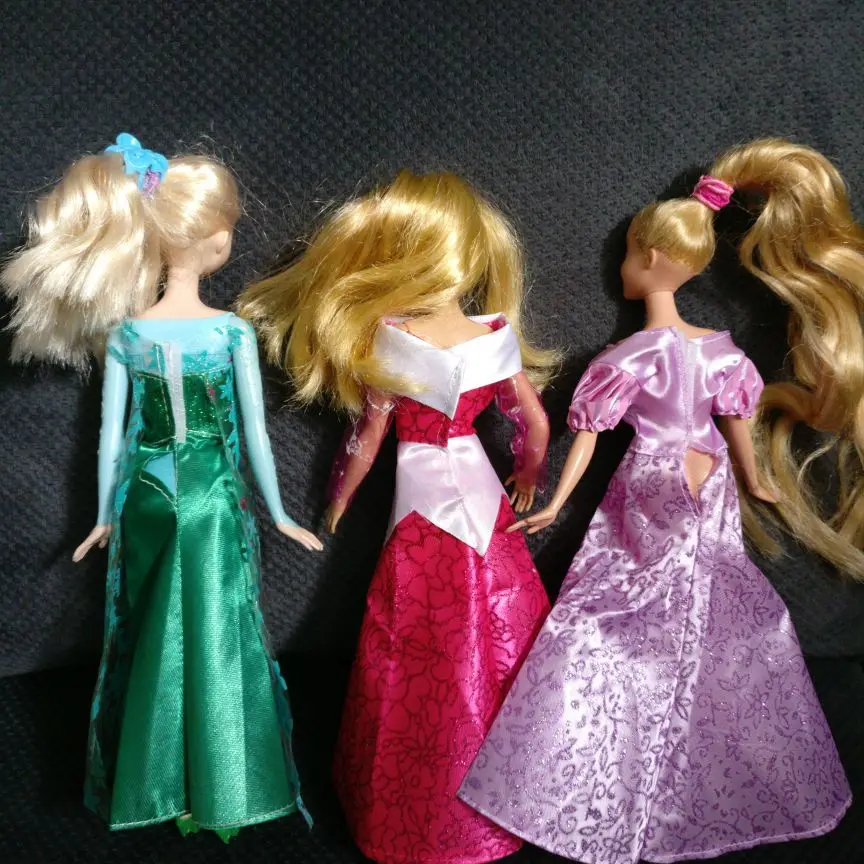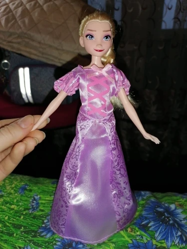 Платье Эльзы очень понравилось как сшито и выглядит. На кукле сидит хорошо. Платье Рапунцель выглядит хорошо, на кукле сидит средне. Платье Авроры не понравилось. Рукава как трубы широкие, юбка очень узкая в бёдрах. Ворот очень массивный. И на кукле и без куклы смотрится плохо.