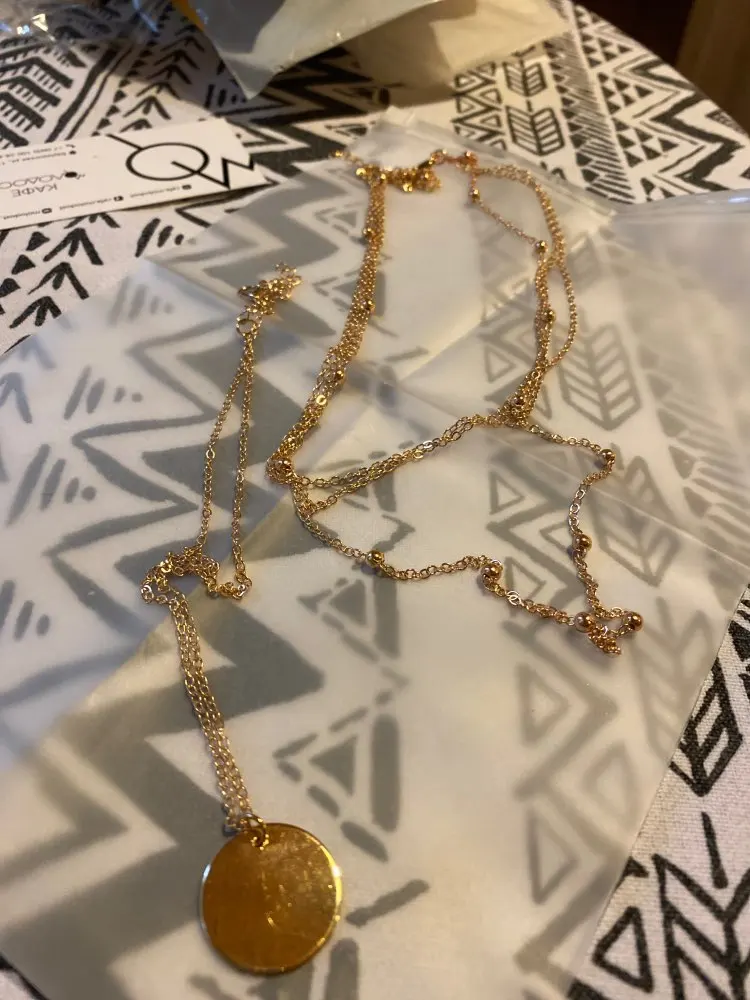 Заказ в Центральную Россию шёл меньше месяца. Очень удобно, что объединили с заказом из другого магазина, и я получила оба в одном пакете. Ожерелье очень красивое, качественное, лёгкое. Цепочки и подвески тоненькие и изящные, но вполне крепкие. Длину можно регулировать - смотря как застегнёшь. Боялась, что цвет может оказаться дешёвым жёлто-зелёным, но он просто замечательный - жёлто-золотистый, как настоящее золото. Покупкой очень довольна!