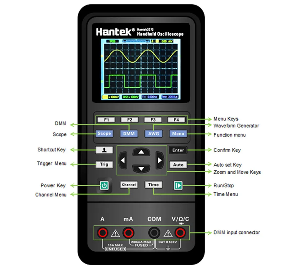 Совершенно новая портативная серия oscilloscope-Hantek2000, она продолжает компактную и легкую концепцию, но с многофункциональным тестером 3 в 1 нового поколения: осциллограф, источник сигнала и мультиметр; небольшой объем некоммерческого захвата одной рукой; Подвесная подставка была разработана для поддержки многоугольной регулировки; Ультра-низкое энергопотребление, интерфейс зарядки типа C, Каждые 2 часа заряда батареи позволяют работать один полный день или в режиме ожидания два месяца; Цветной ЖК-дисплей высокой четкости четкий и деликатный; Минималистичный дизайн клавиатуры упрощает работу, прост в использовании.