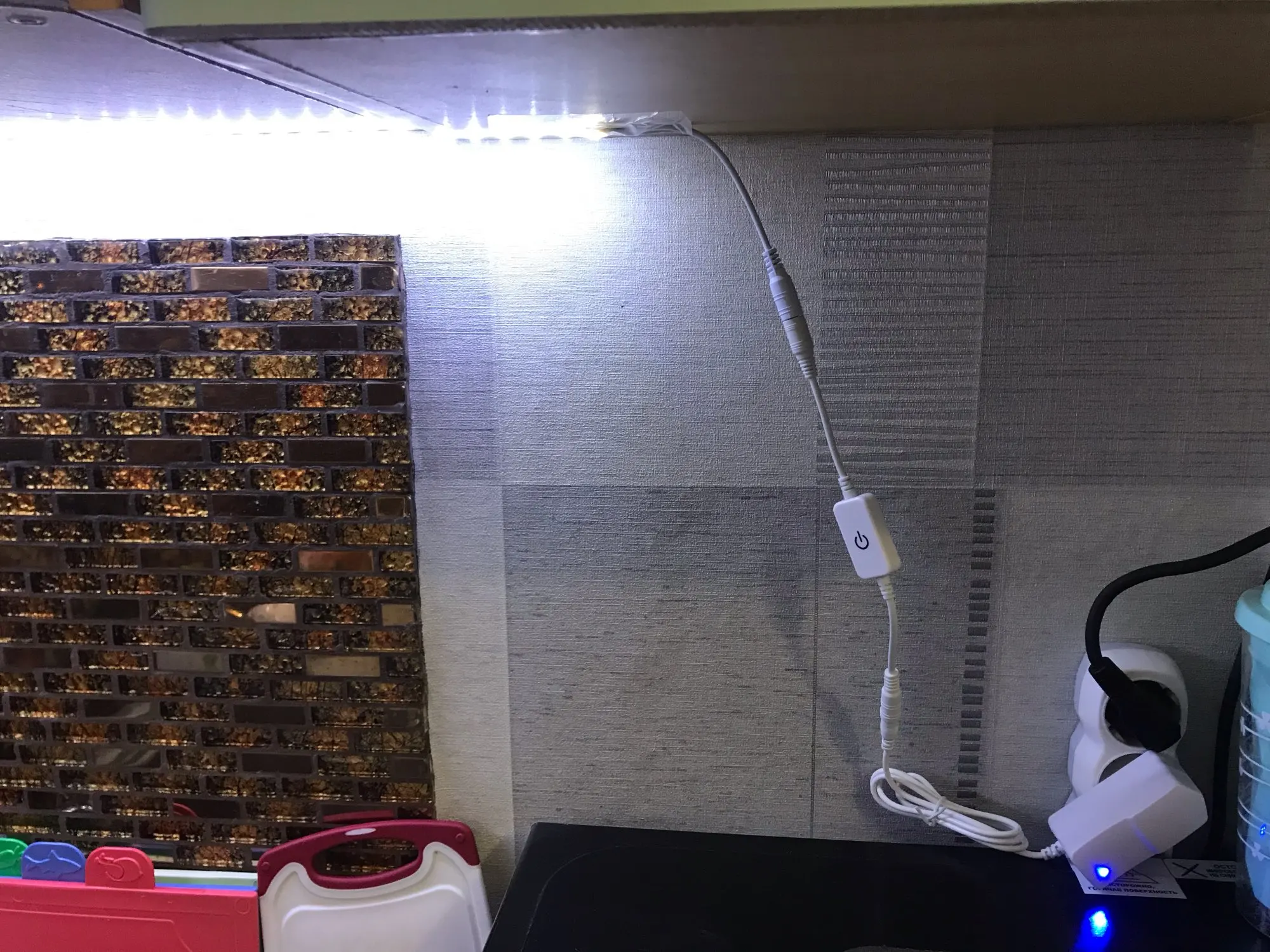 Повесила на шкафчики кухни. Яркость регулируется. В качестве самостоятельного освещения можно использовать только как ночник. А так, как дополнение к основному освещению, очень даже замечательно.