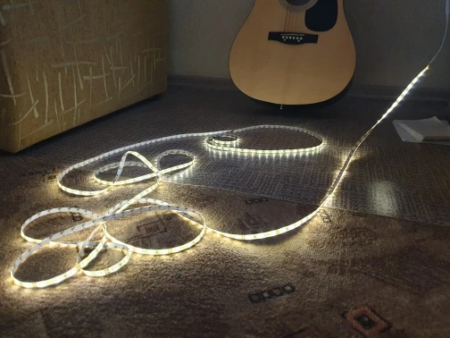Отличная лента! Светит просто здорово! Можно переключать яркость и режим свечения, последнее мне особо не нужно было, но да ладно. Единственный недостаток - это клей на обратной стороне, но я решил этот вопрос крепежами. Доставка в МО г. Люберцы ооочень быстрая