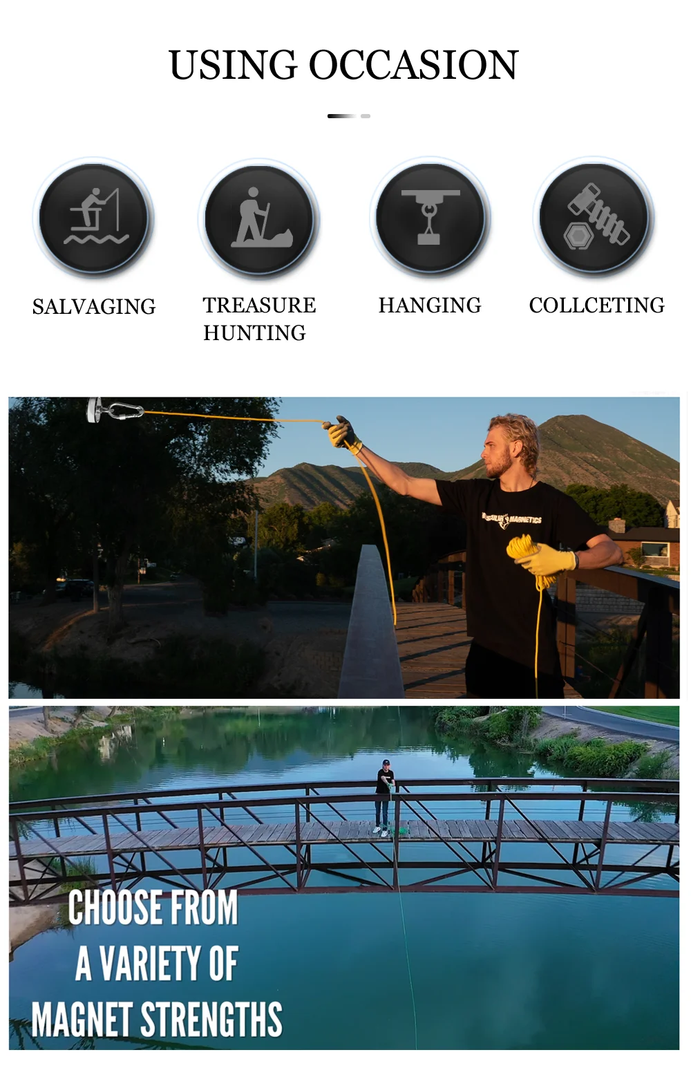 Магниты Xhigh предназначены для тяжелых и подводных работ. Это может помочь вернуть утерянное оборудование, инструменты, рыболовные снасти и другие железные предметы в глубоководных водах, колодцах, отверстиях. Он также отлично подходит для магнитной рыбалки, подъема, подвешивания и извлечения.