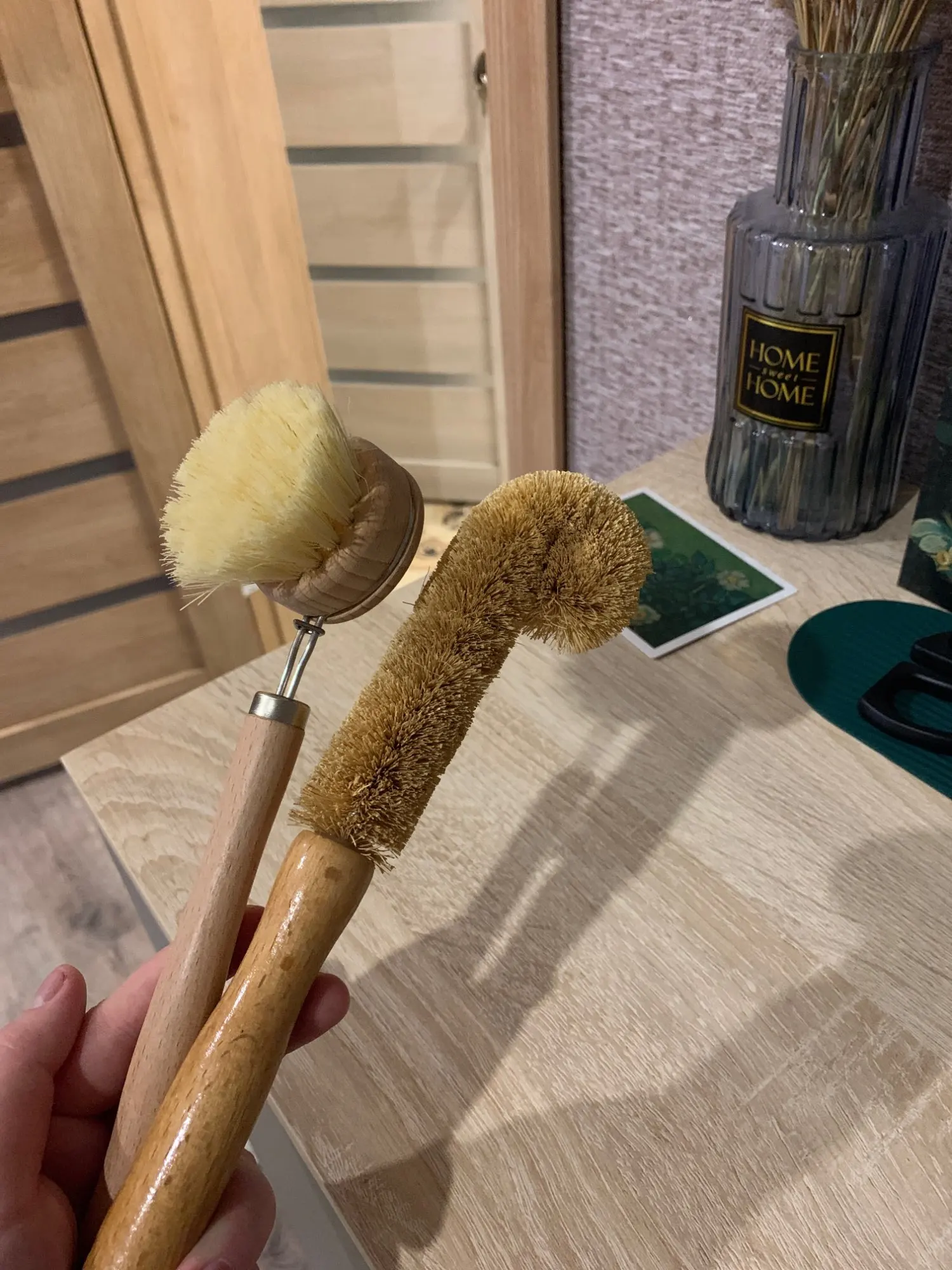 интересные щеточки, жесткий материал, ручка деревянная, щетка гнется относительно ручки