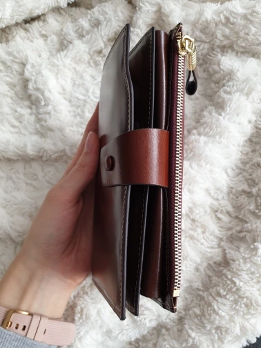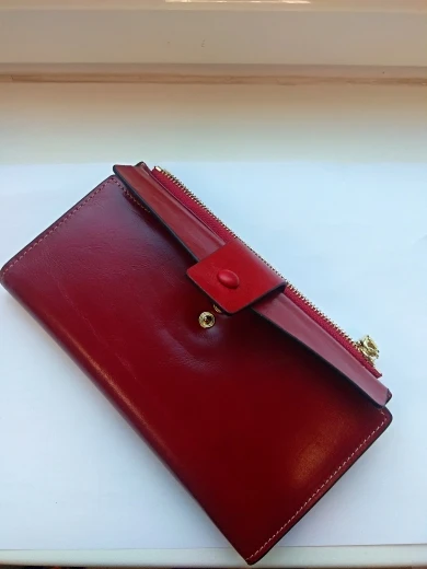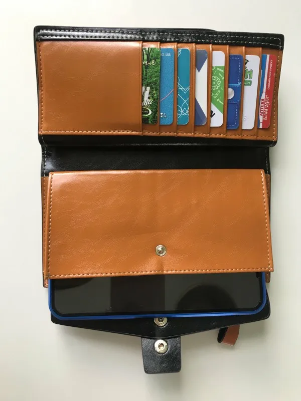 Брала в основном кошелек для карт и телефона. Телефон поместился в отделение под кнопкой, в принципе все устраивает, только цвет оказался вместо верблюжьего как я думала, каким-то жёлтым. Кожа или нет однозначно сказать нельзя, проверять не стала, прошит качественно и на том спасибо.