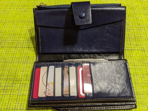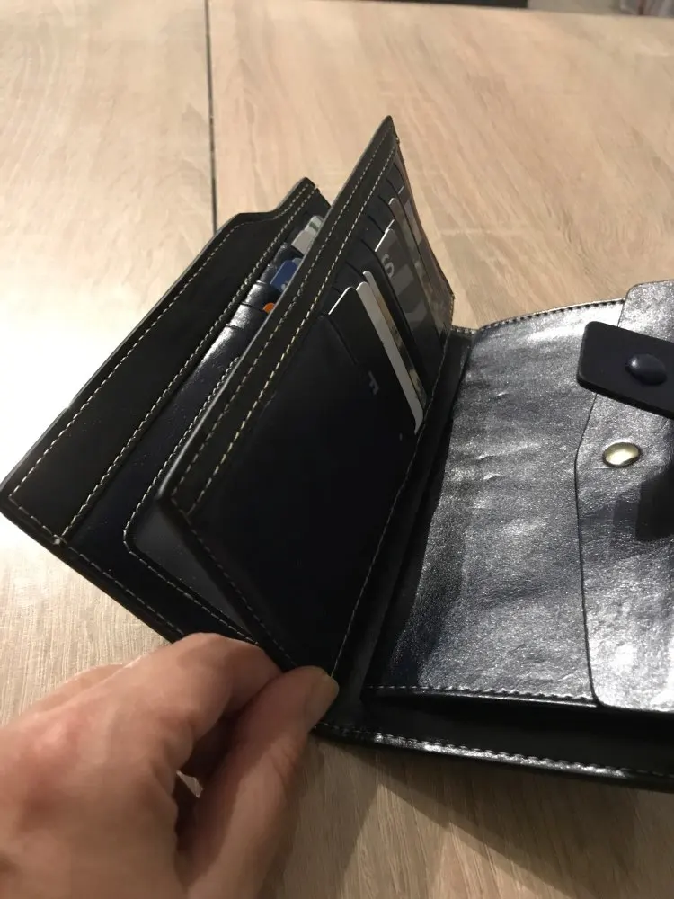Užsakyta 12.27, gauta 01.22 per LP paštomatą. Labai labai talpi piniginė, kaip pardavėjo nuotraukose. Jaučiamas odos kvapas, erzinančio kvapo nėra. Telpa 21 kortelė, viduje yra atskiras skyrius monetoms (užsegamas) ir užtraukiamas skyrius banknotams.