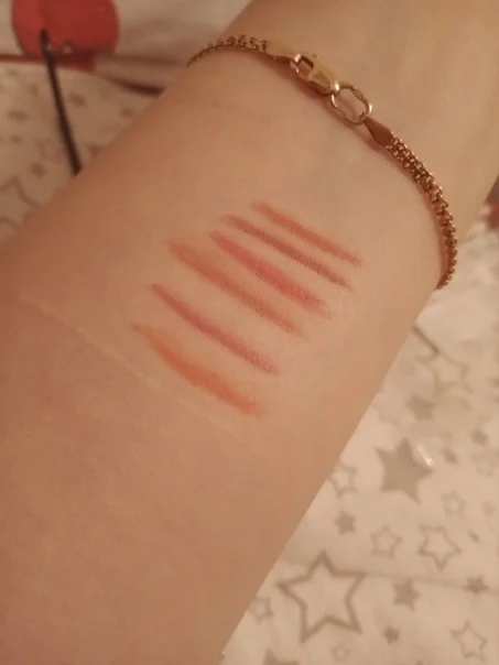 Карандаши мягкие, хорошо ложатся на губы, не царапают. Картинке соответствуют, но на губах выглядят гораздо светлее. Два цвета, которые самые светлые, у меня на губах получаются оранжевые) А доставка вообще капец) ехали 3 месяца, через Узбекистан) Хорошо, что вообще доехали)
