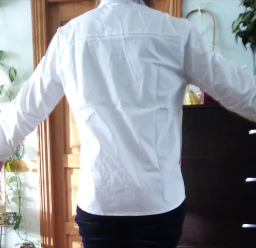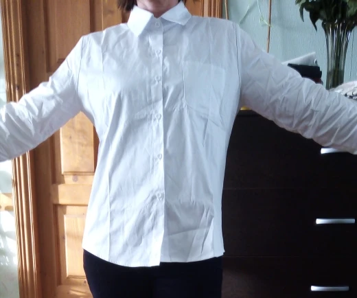 На ОГ 96 размер сел с небольшим запасом. Ткань плотная, смотрится очень хорошо. Цвет чисто белый без оттенков. Длина рукава на рост 156 идеальна, но линия плеч ниже см на 3.