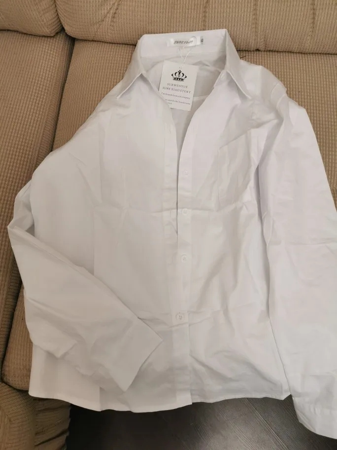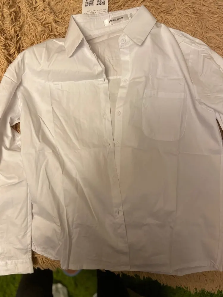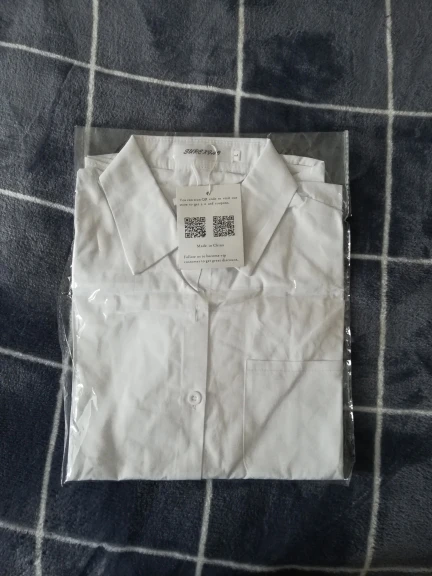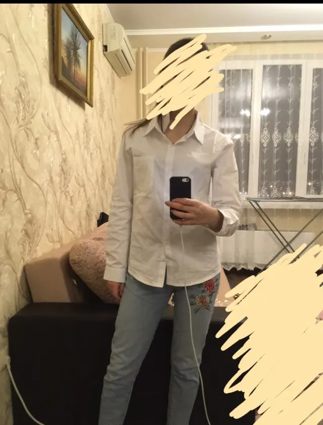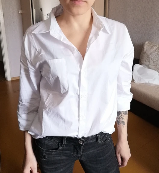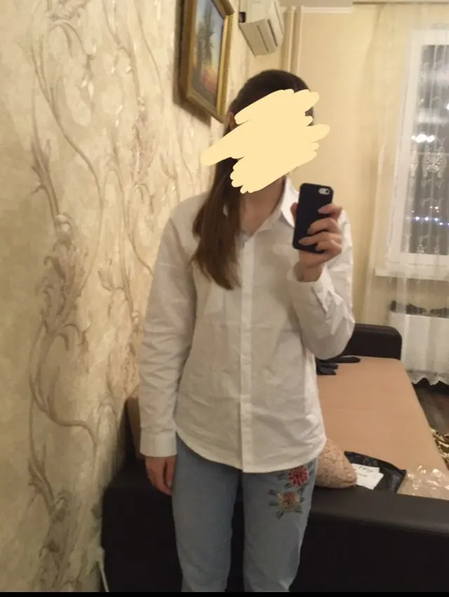 Рубашка дошла за 9 дней, трек отлеживался. На размер С брала ХЛ, чтобы была как оверсайз. Плотная, не просвечивает, цвет белоснежный