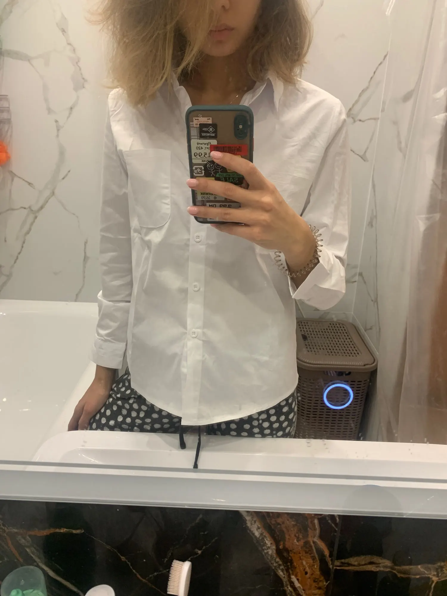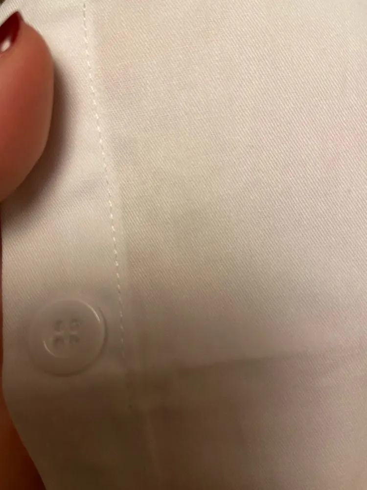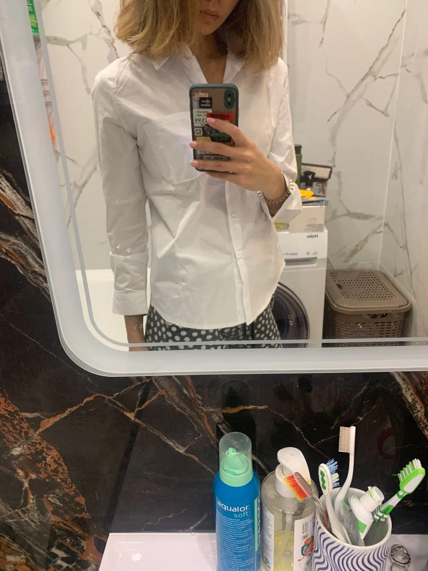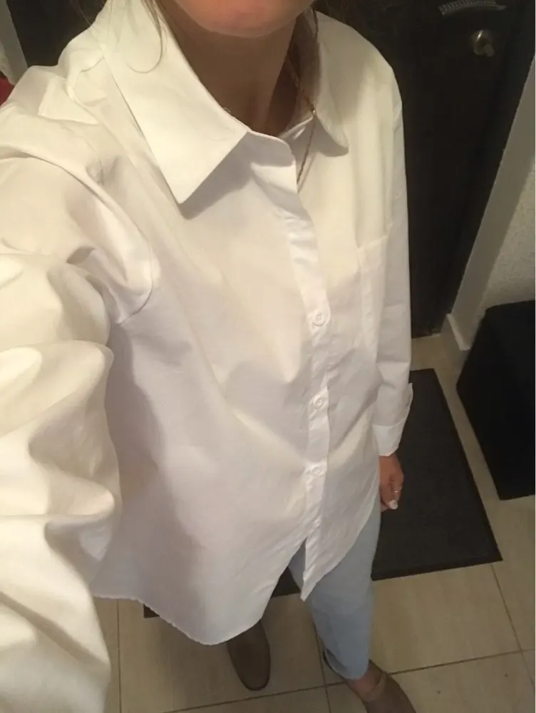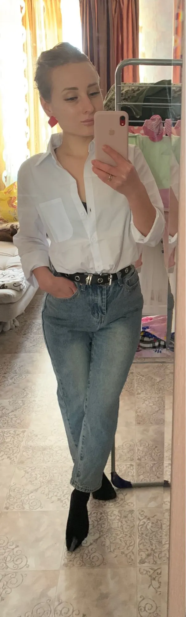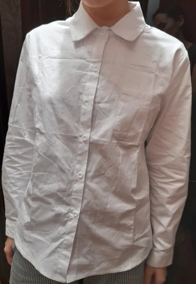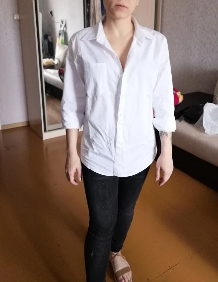 Хорошая рубашка, брала на размер больше чтобы была оверсайз мои параметры 92-74-96/168. Цвет белый, слегка просвечивает. Швы ровные, нитки не торчат, запаха нет. Постирала на 30° слегка подсела, рукава стали прям впритык, но я подворачиваю) Классная базовая вещь, рекомендую к покупке)