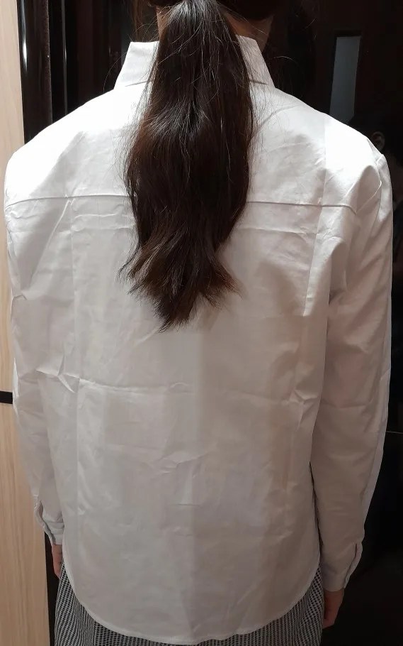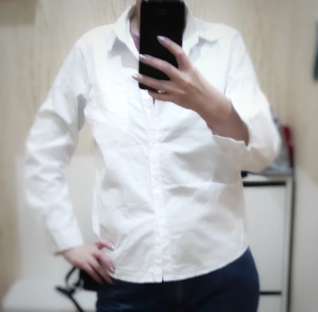 Отличная рубашка. На объем груди 90 нормально. Гладить тяжело, мнется быстро. Качество отличное. Цвет белый. На 46 размер хорошо. Рост 165, вес 60кг. 90/70/100. Фото позже выложу