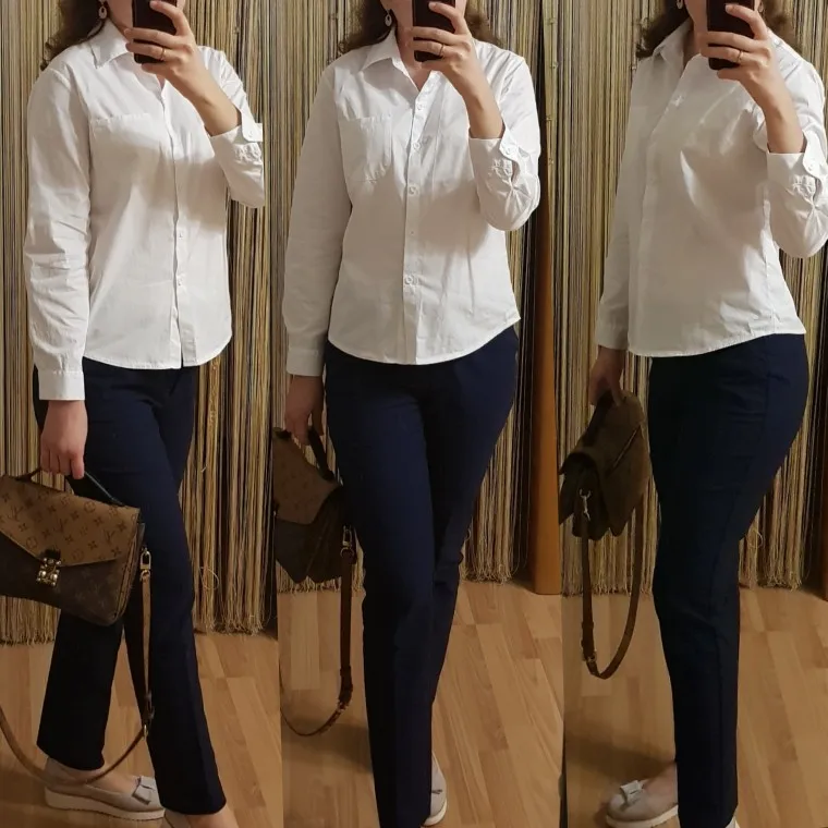 Хорошая рубашка для офиса. Гладится сложно, мнётся, ткань платная. Размер подошёл на мой рост 170 см, 82/66, плечи широкие, села как надо. Рукава слегка коротковаты но не критично. Я довольна.