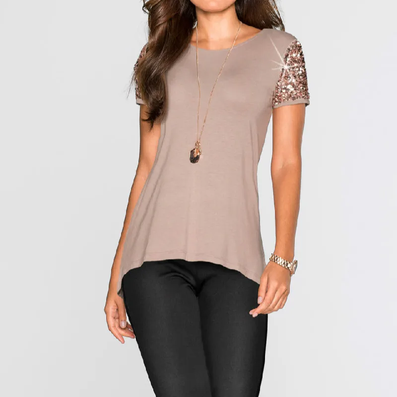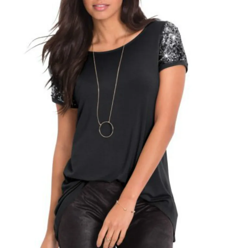 Женские футболки, сексуальные Лоскутные Топы с блестками и коротким рукавом, повседневный женский джемпер, пуловер, рубашка, цвета хаки, красный, черный