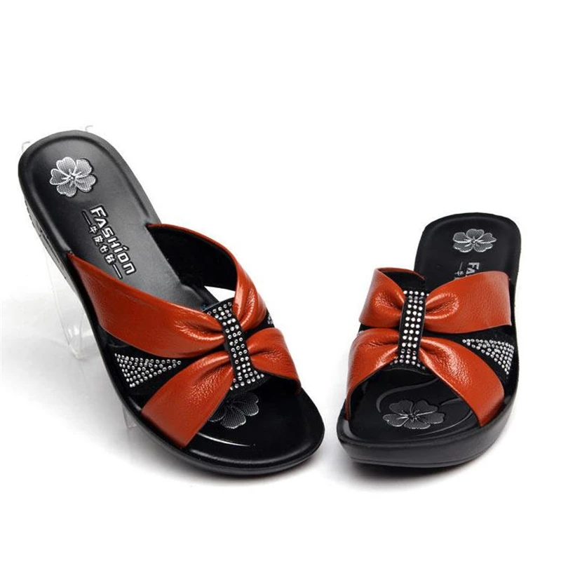 YAERNIженские шлепанцы из натуральной кожи; Стразы; Модные женские сандалии для мамы среднего возраста; Женские сандалии-шлепанцы; Большие размеры; E777