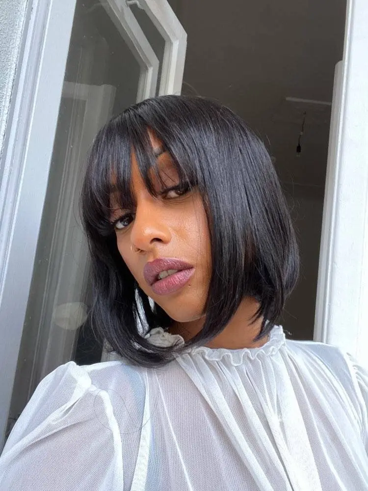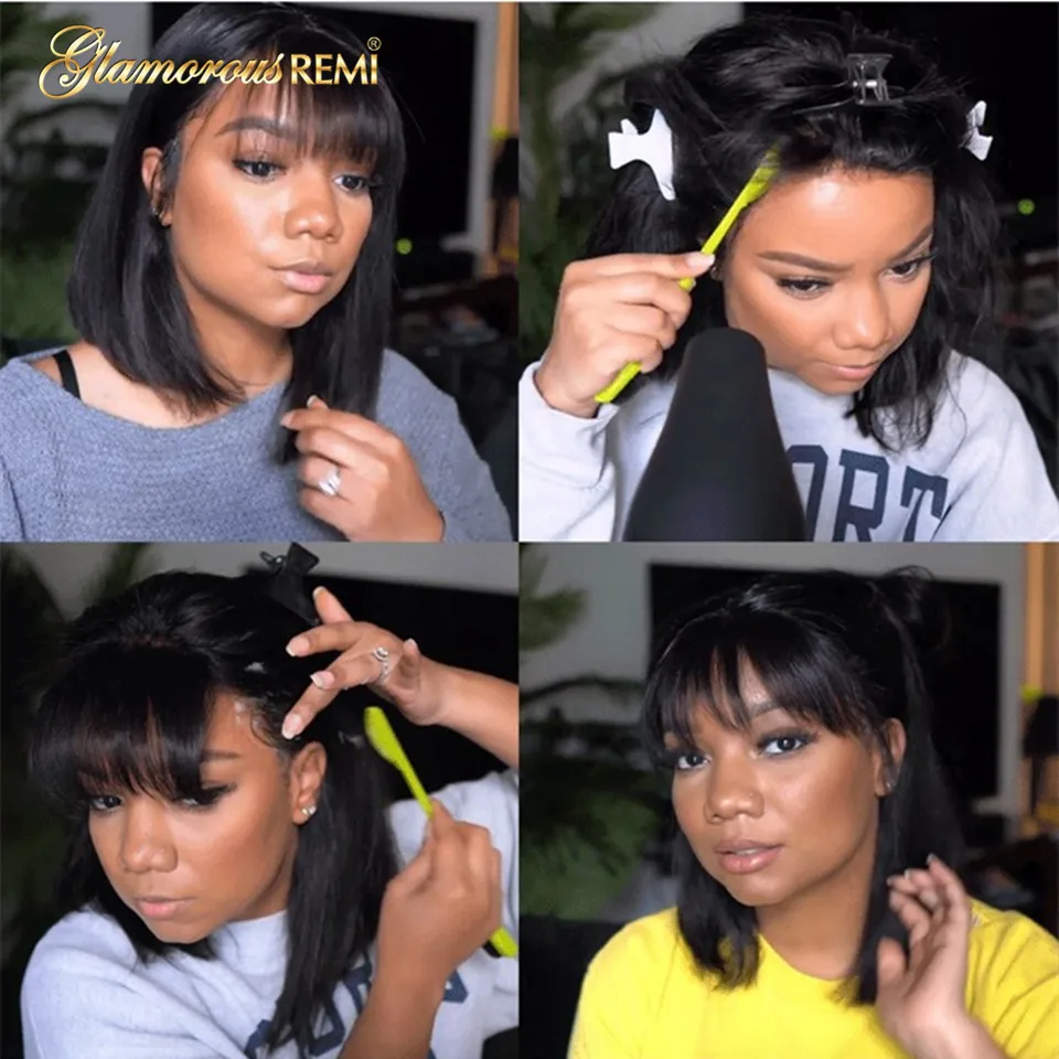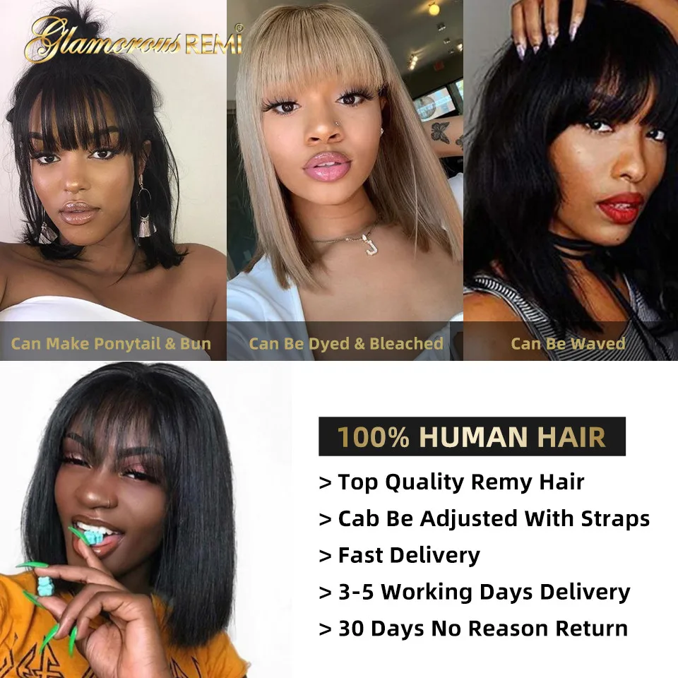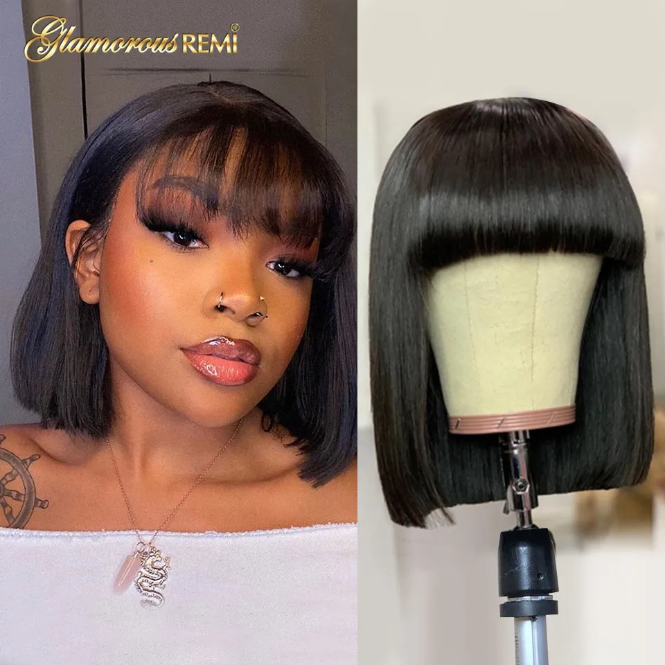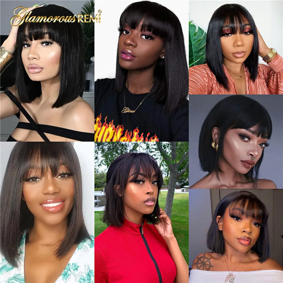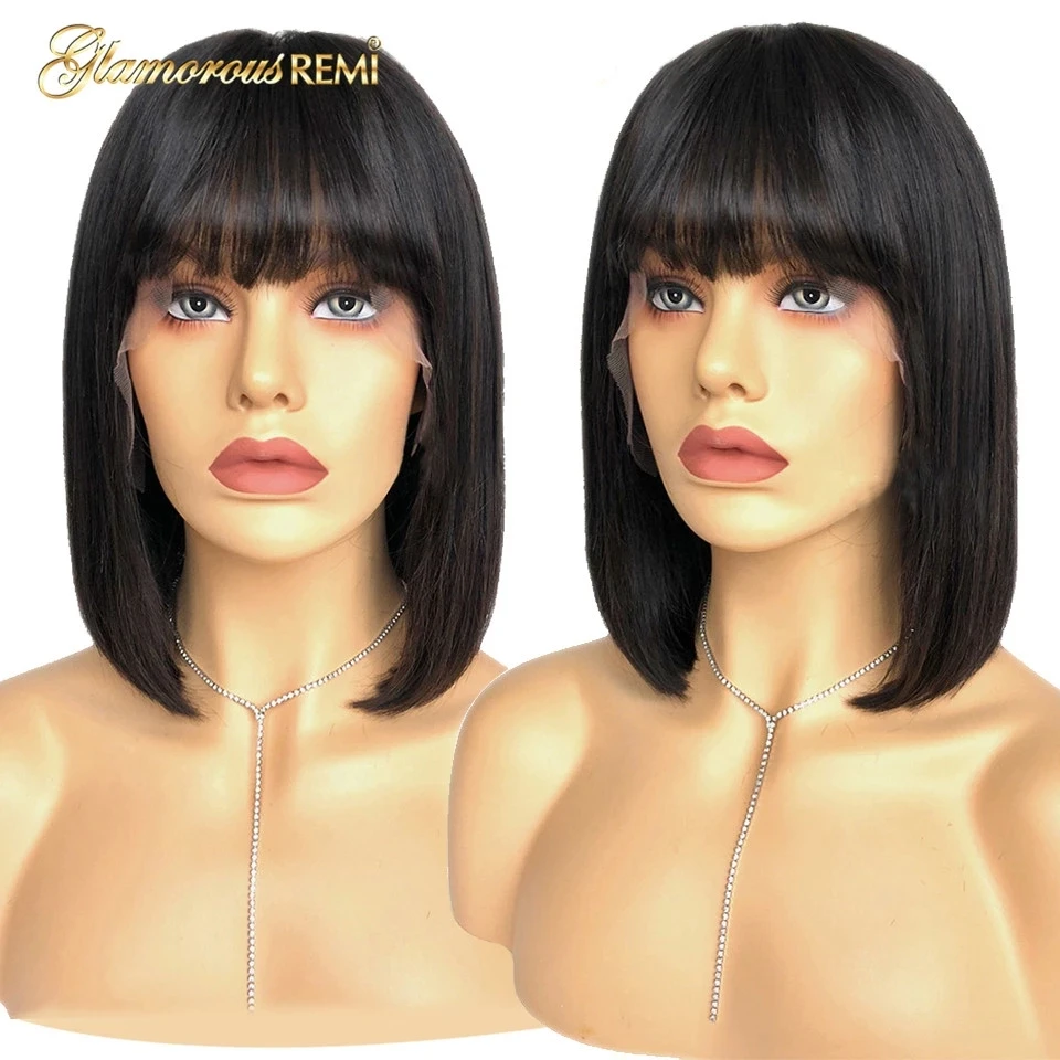Прямые короткие парики боб, бразильские прямые человеческие волосы машинной работы, парики с челкой для женщин, черный естественный цвет, плотность волос 180