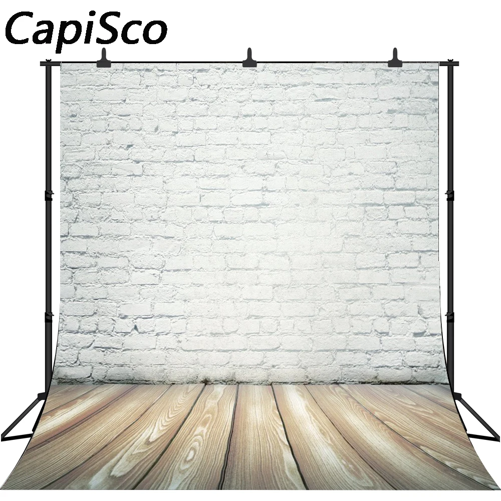 Фон для фотосъемки новорожденных с изображением белой кирпичной стены и деревянного пола