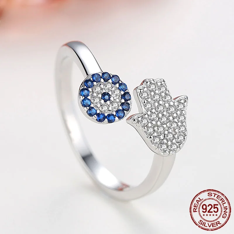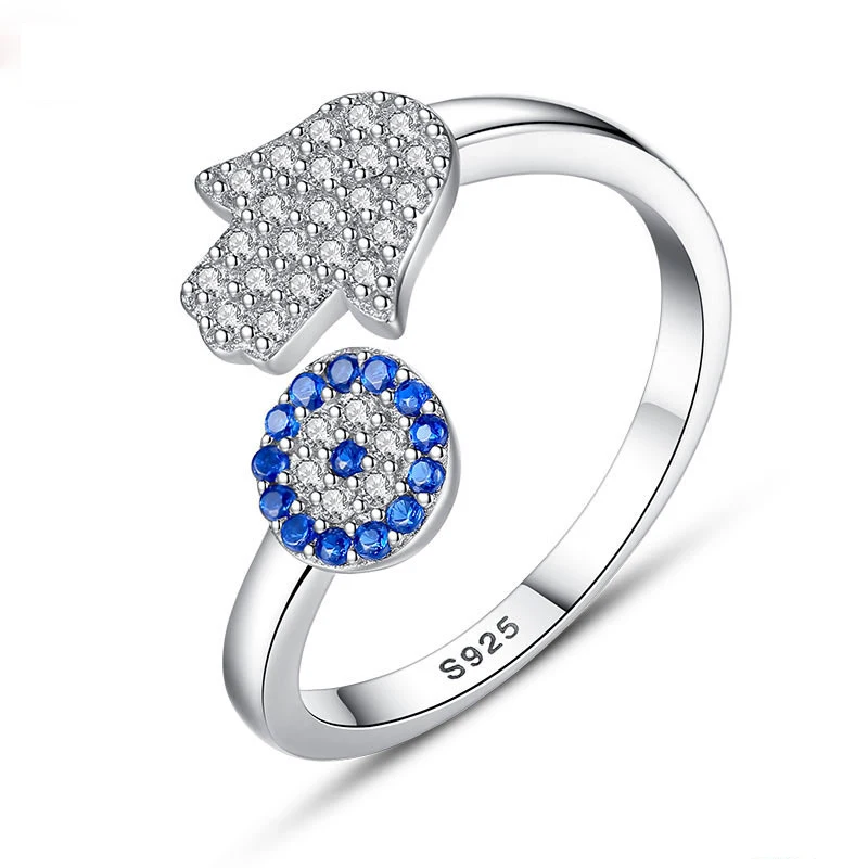 TONGZHE 925 пробы Серебряное кольцо с голубым глазом и Хамзой рука, Фатима регулируемые женские кольца открытого размера Кольцо Свадебные ювелирные изделия 2019