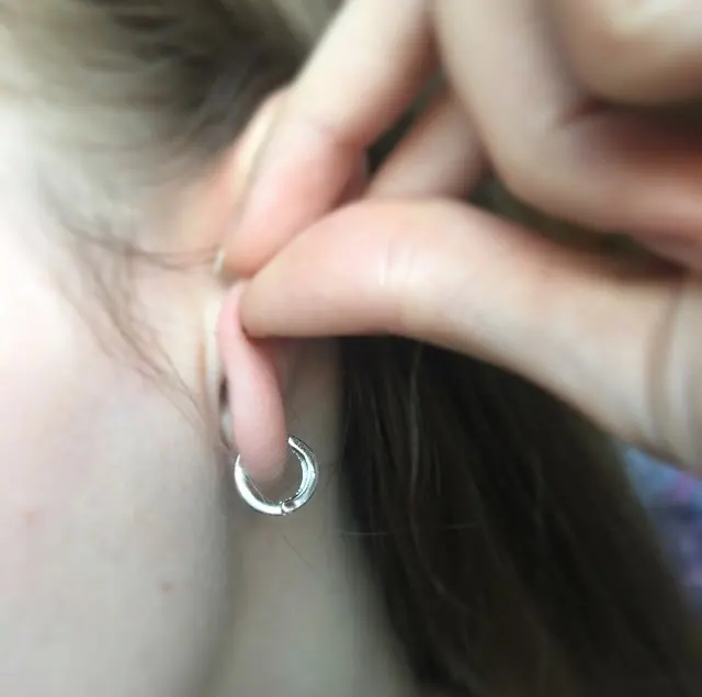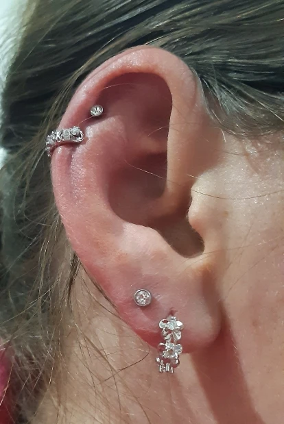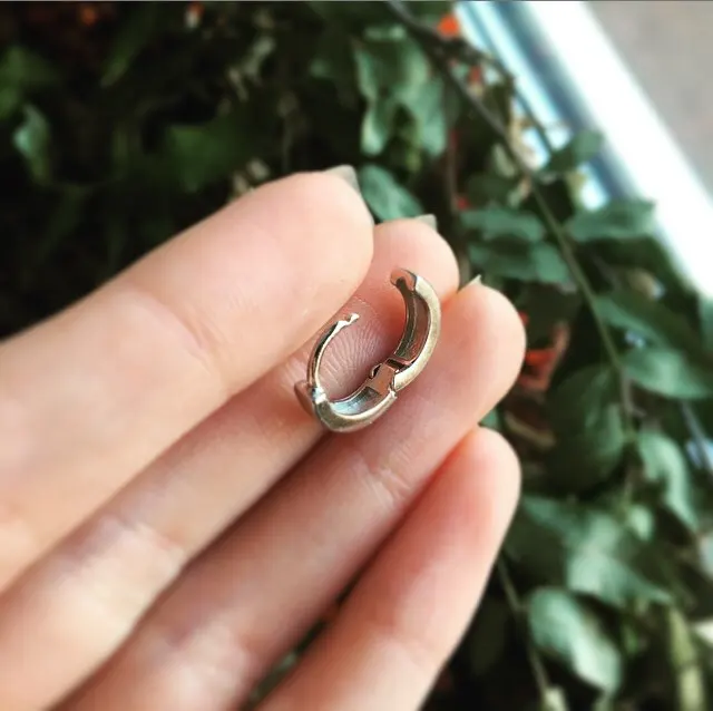 Маленькие, замок работает хорошо, блестящего серебристого цвета. Ношу уже час и пока ухо не загноилось)