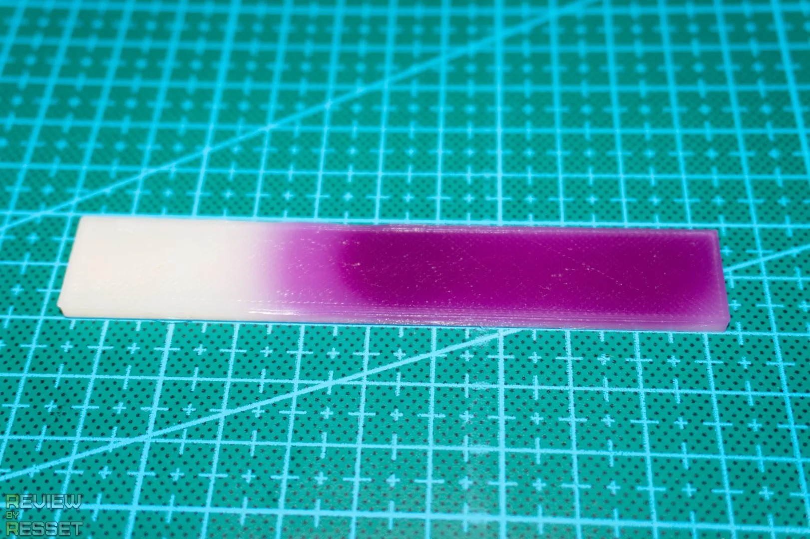 Качественный PLA, отлично липнет к столу, слои спекаются замечательно, даже тонкую 3мм пластинку со 100% заполнением пальцами сломать довольно сложно, переход виден отчетливо, темнеет как от УФ источников, так и от солнечного света.