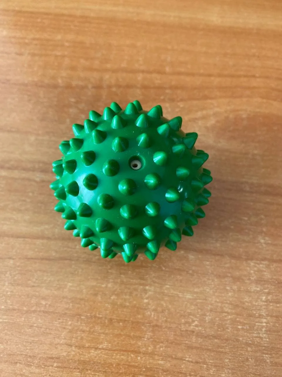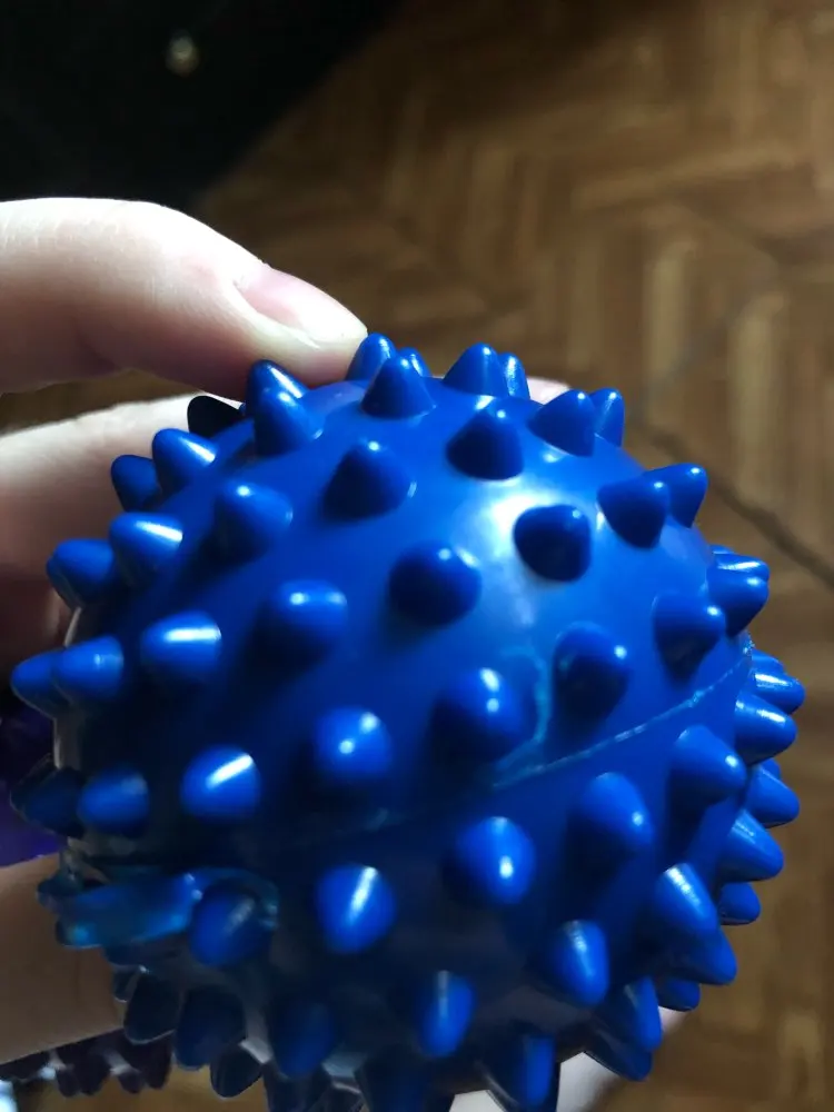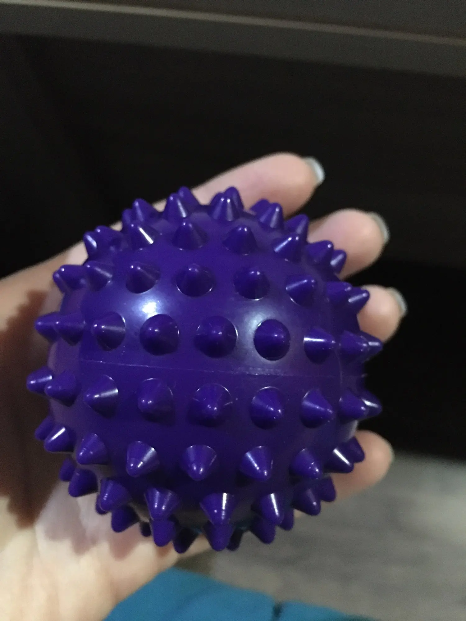 массажный шар оказался из пластмассы, твердый, но в принципе, свою функцию он выполняет, жесткие шипы, по подошве отличный результат, мне нравится. доставка быстрая в Якутию меньше месяца. продавцу процветания