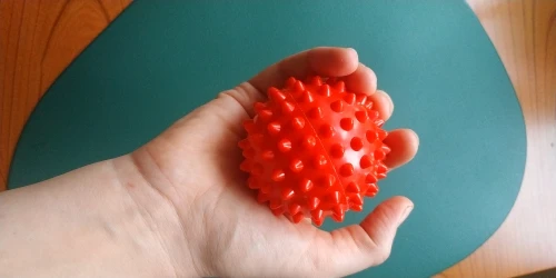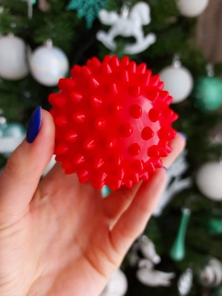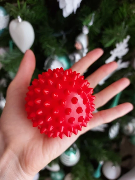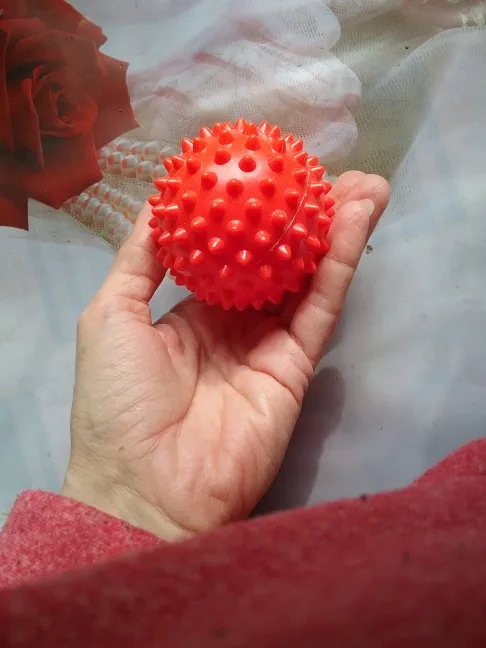 Мяч скользкий, пластмассовый. Шипчики короткие. Скользит по телу, это не очень хорошо. Покупала в аптеке мяч более резиновый, шипы не скользят и от этого эффект лучше.