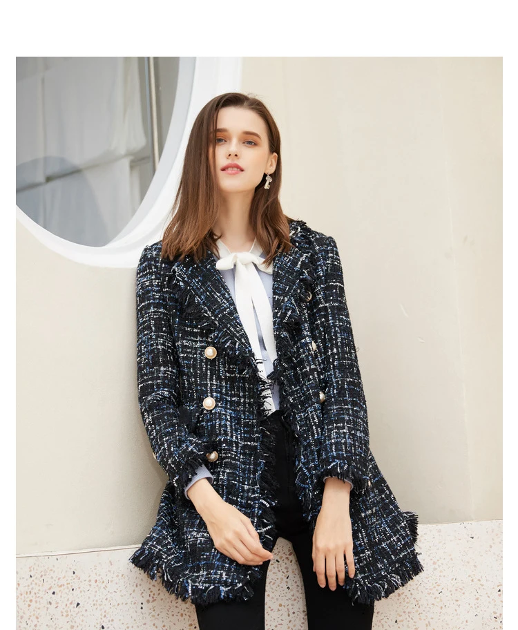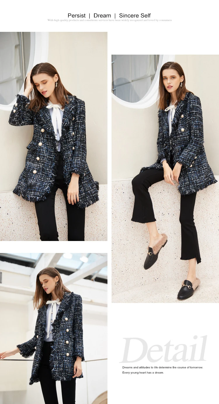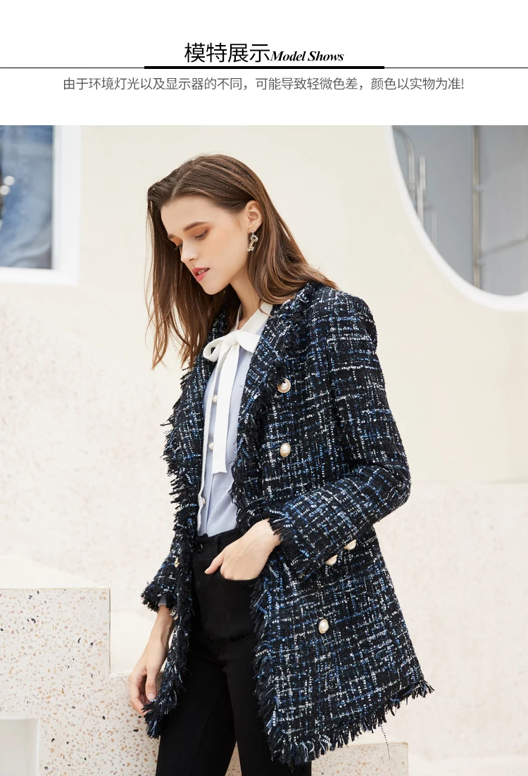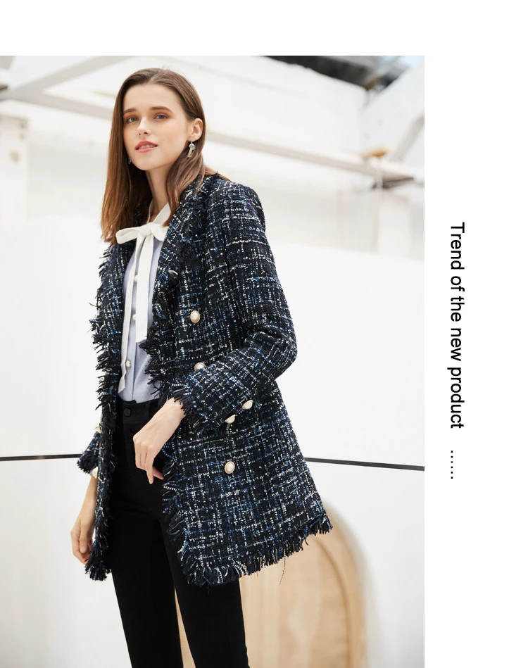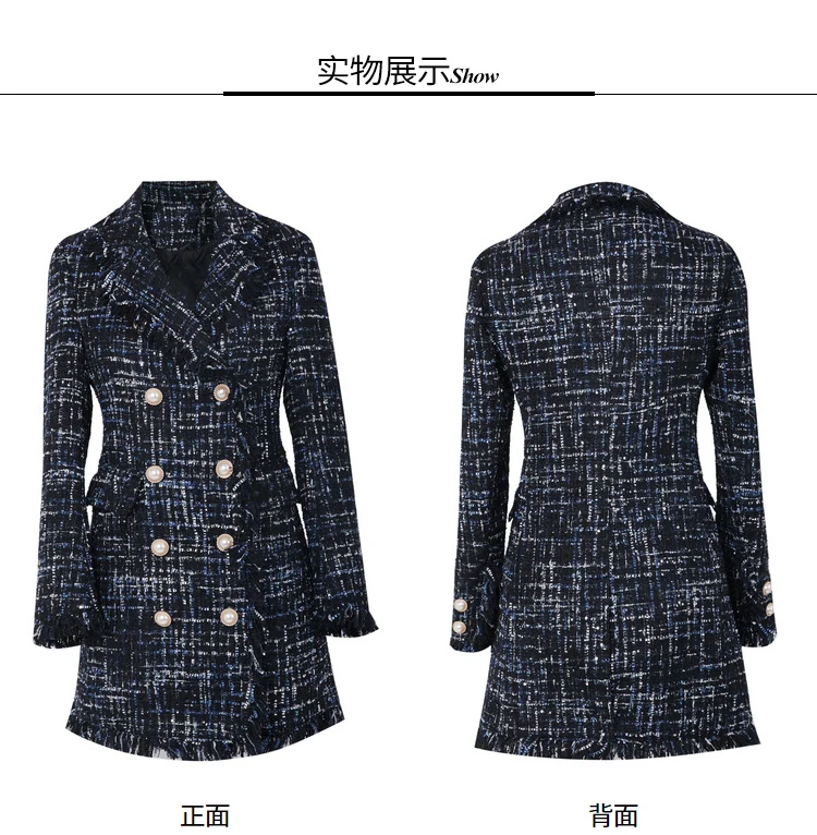 Темно-синее твидовое пальто средней длины цельный женский жакет на осеньзиму новый небольшой аромат Дамская куртка пальто