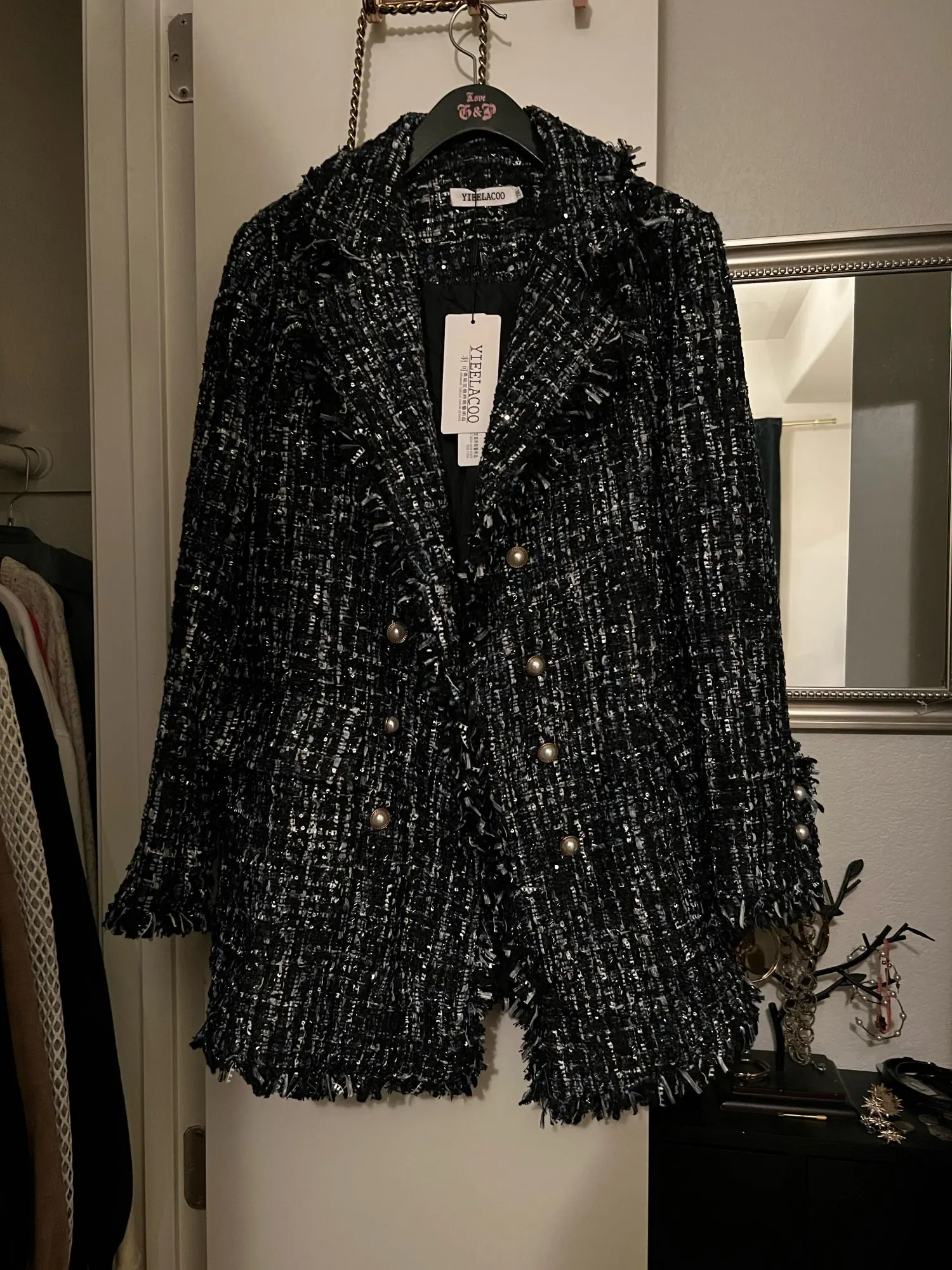 Спасибо продавцу! Со мной вежливо общались, быстро отвечали и правильный подобрали размер. На размер 92-82-100, рост 158, вес 61 мне посоветовали L. Сидит прекрасно, паетки я не увидела на фотографии, а в живую с люриксом и серебристыми паетками. Гламурно, красиво, с подкладом, практически пальто!