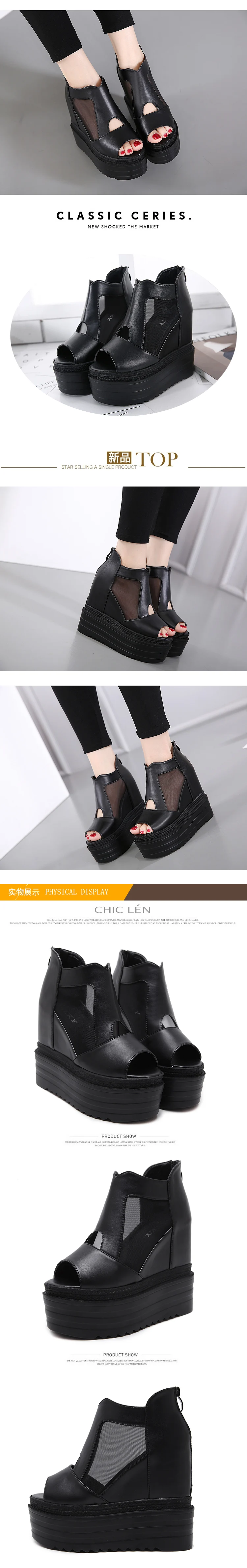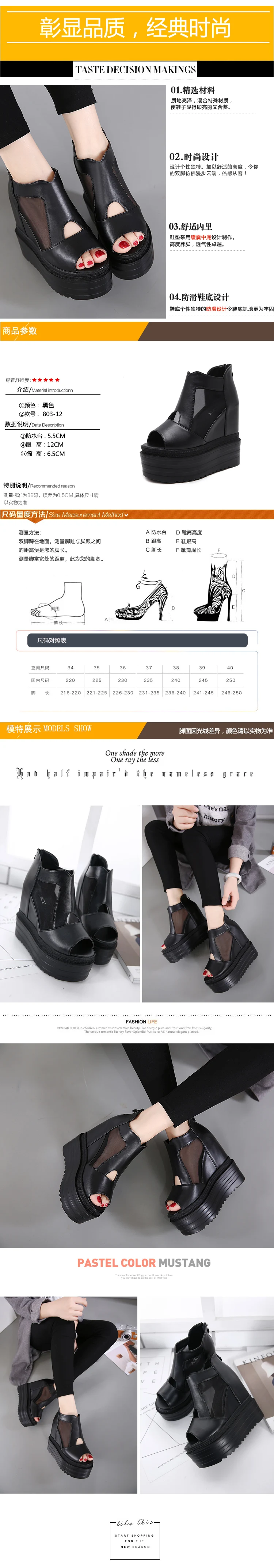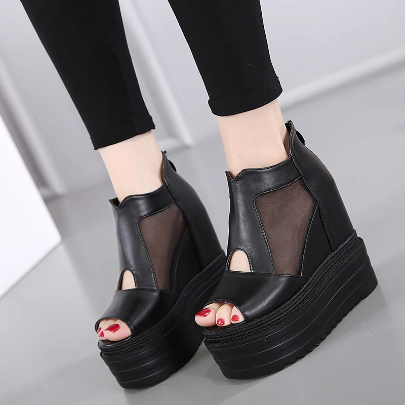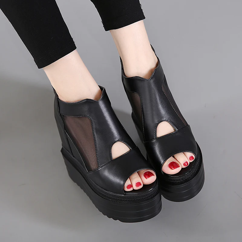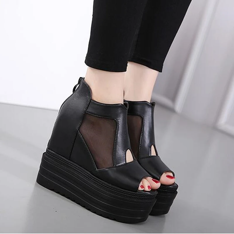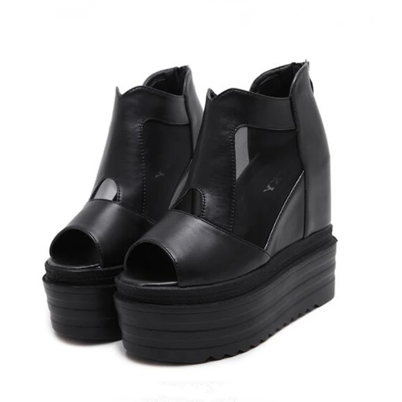 Женские босоножки на танкетке 12 см, сетчатые сандалии на высокой толстой подошве, с открытым носком, прохладные внутренние сапоги, европейская обувь