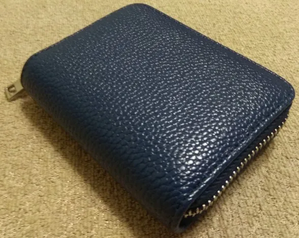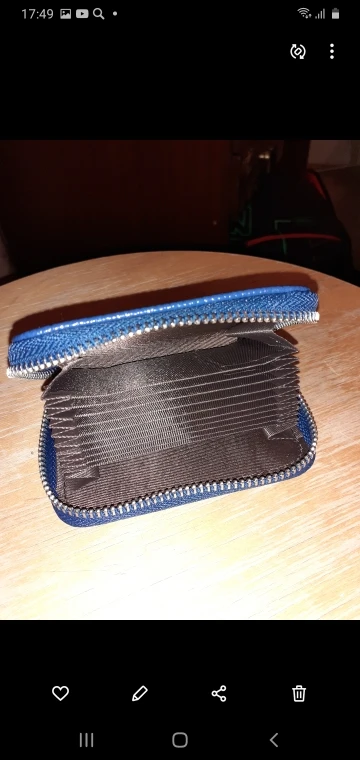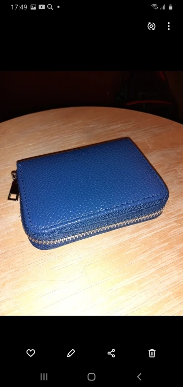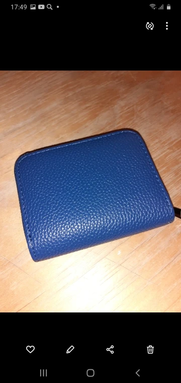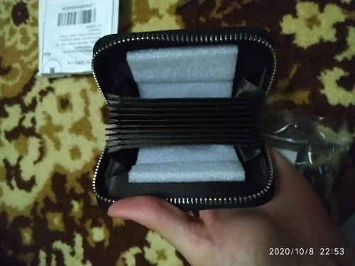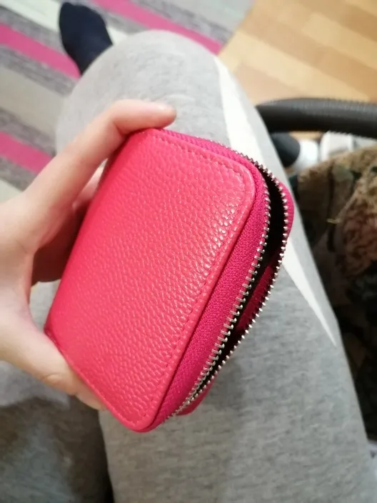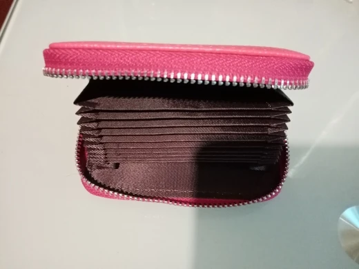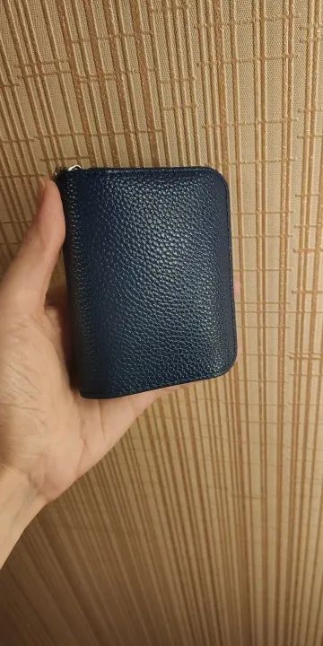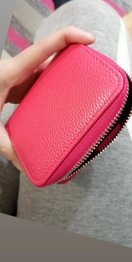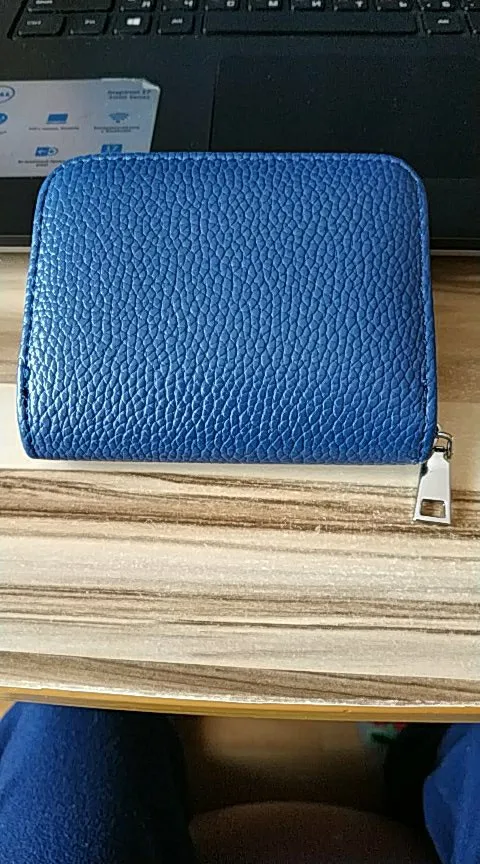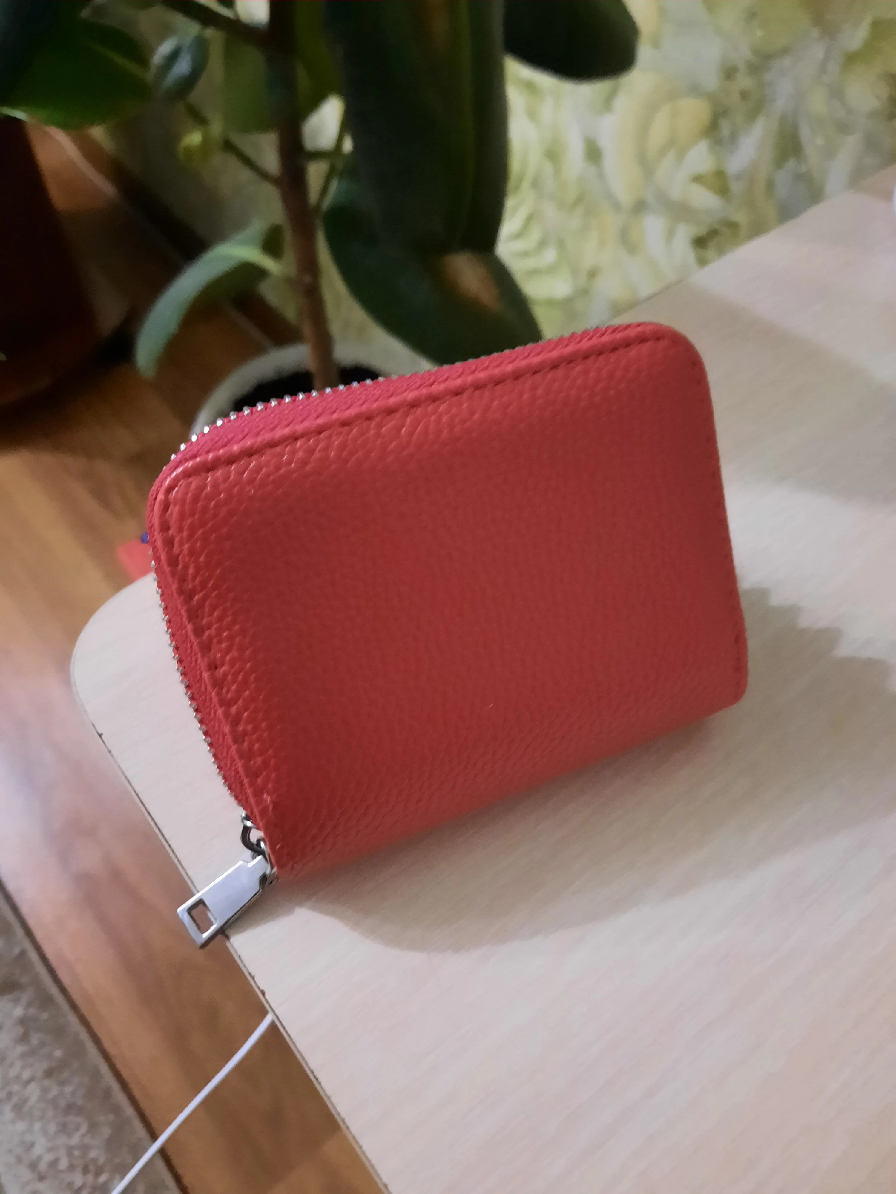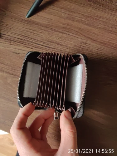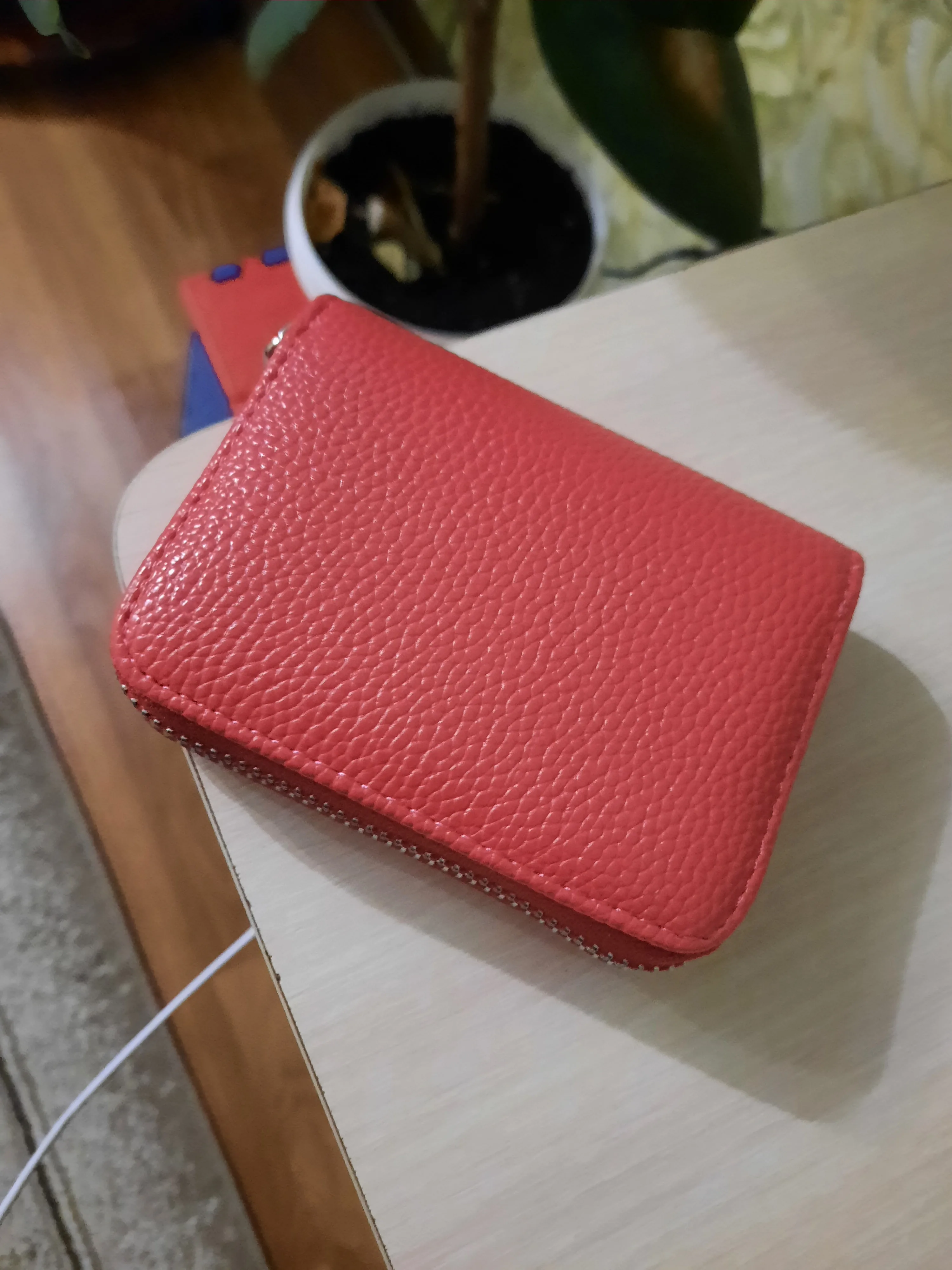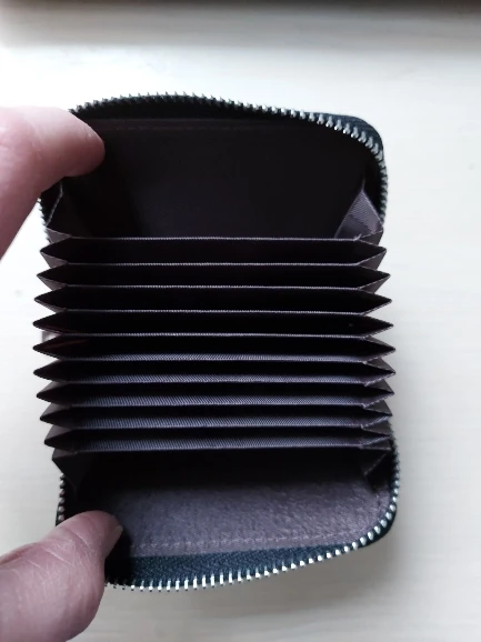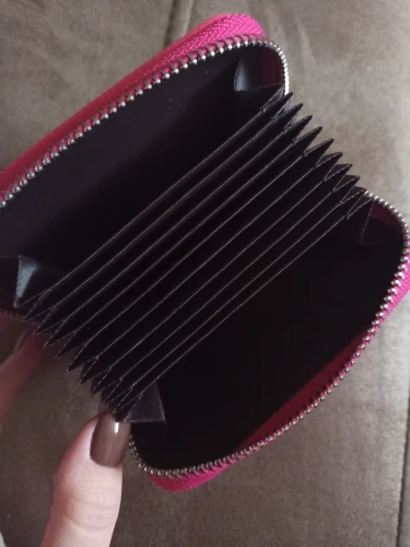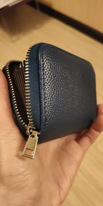 маленький и милый кошелёчек..10 отделений для карт.можно ещё бумажные деньги,и совсем мелочёвку носить.прошит хорошо...не пахнет вообще ! на 100%кожаность не проверяли.синий в жизни более яркий,чем на фото.отделения для карт не вываливаются..