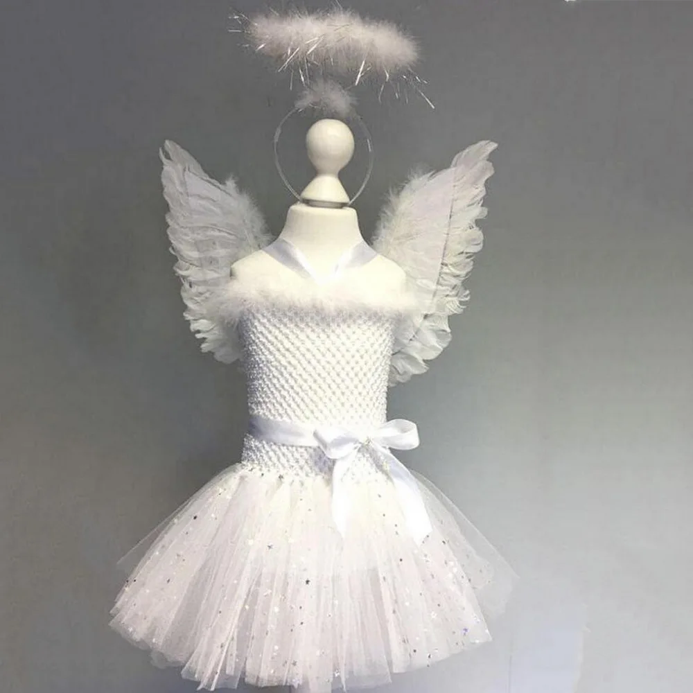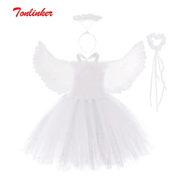 Детское платье-пачка на Хэллоуин, белые блестящие Костюмы Ангелов для девочек, перо с крыльями и сказочными бриллиантами, костюм для косплея и вечеринки