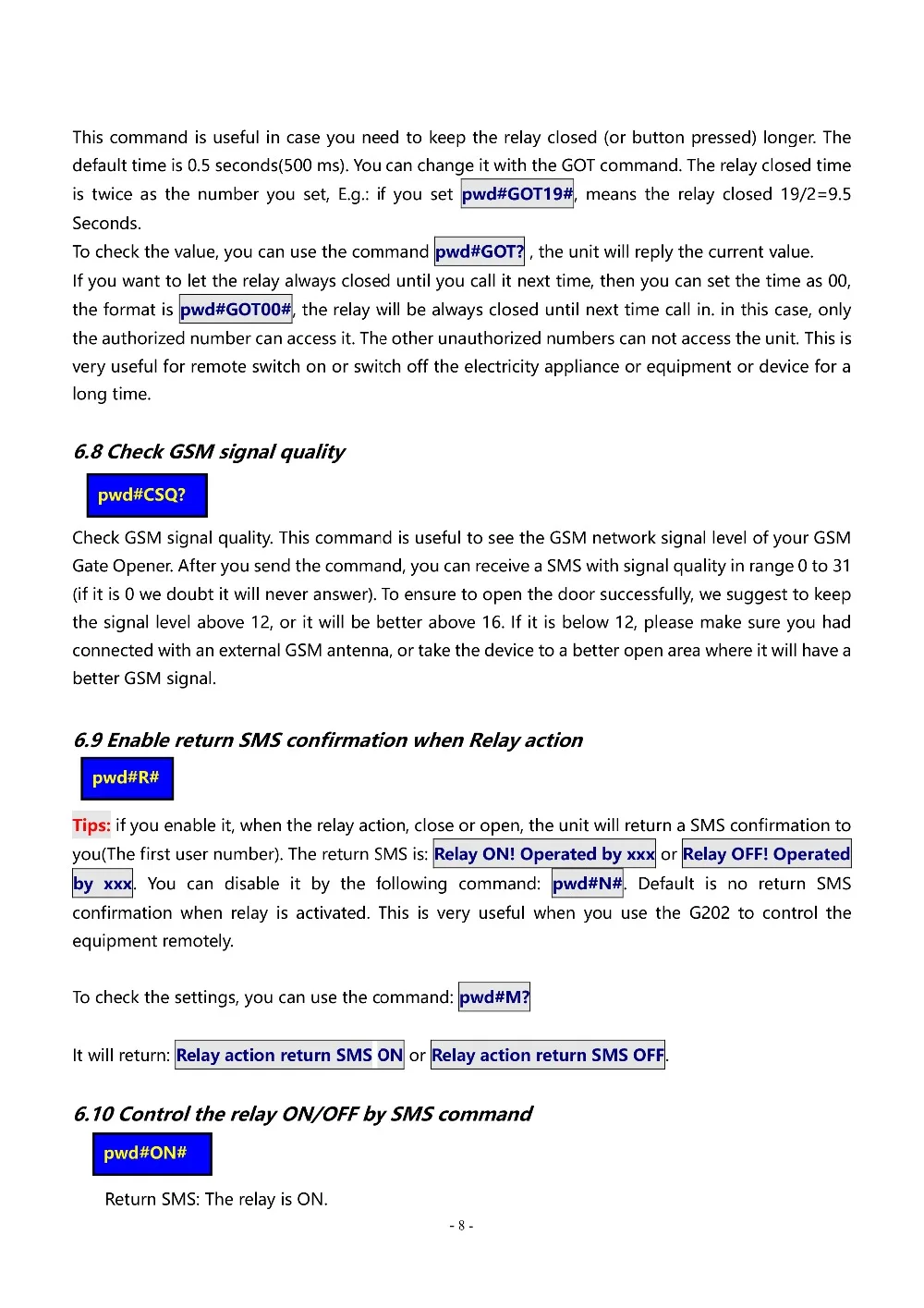 10. Действие реле вернет подтверждение SMS владельцу, эта функция редактируется пользователем;