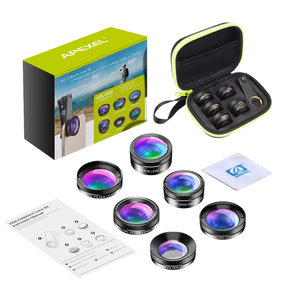 Объектив APEXEL 6 в 1 для камеры телефона, объектив рыбий глаз, широкоугольный макрообъектив cpl, фильтр 2X tele для iPhone, huawei, все телефоны, Прямая поставка