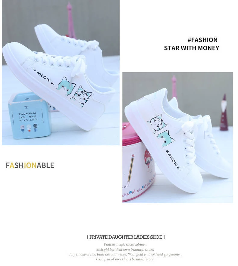 Женские кроссовки из искусственной кожи с принтом, повседневные, на шнуровке, с милым котом, 2019