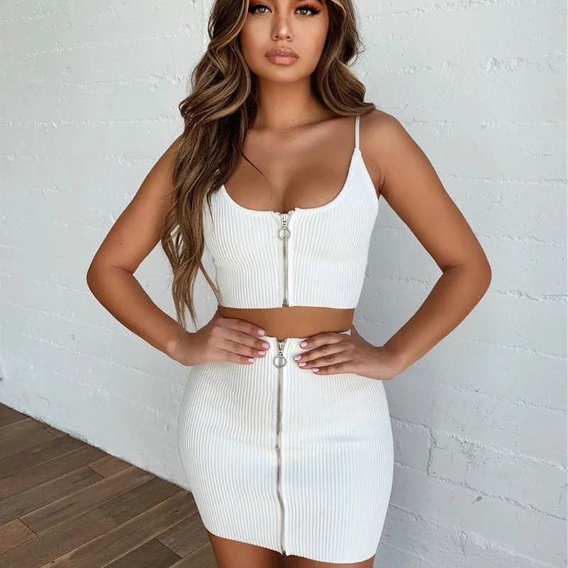 Женский комплект из двух предметов, соблазнительное платье на бретельках без бретелек, мини-платье без рукавов, однотонный короткий топ на молнии и короткое платье