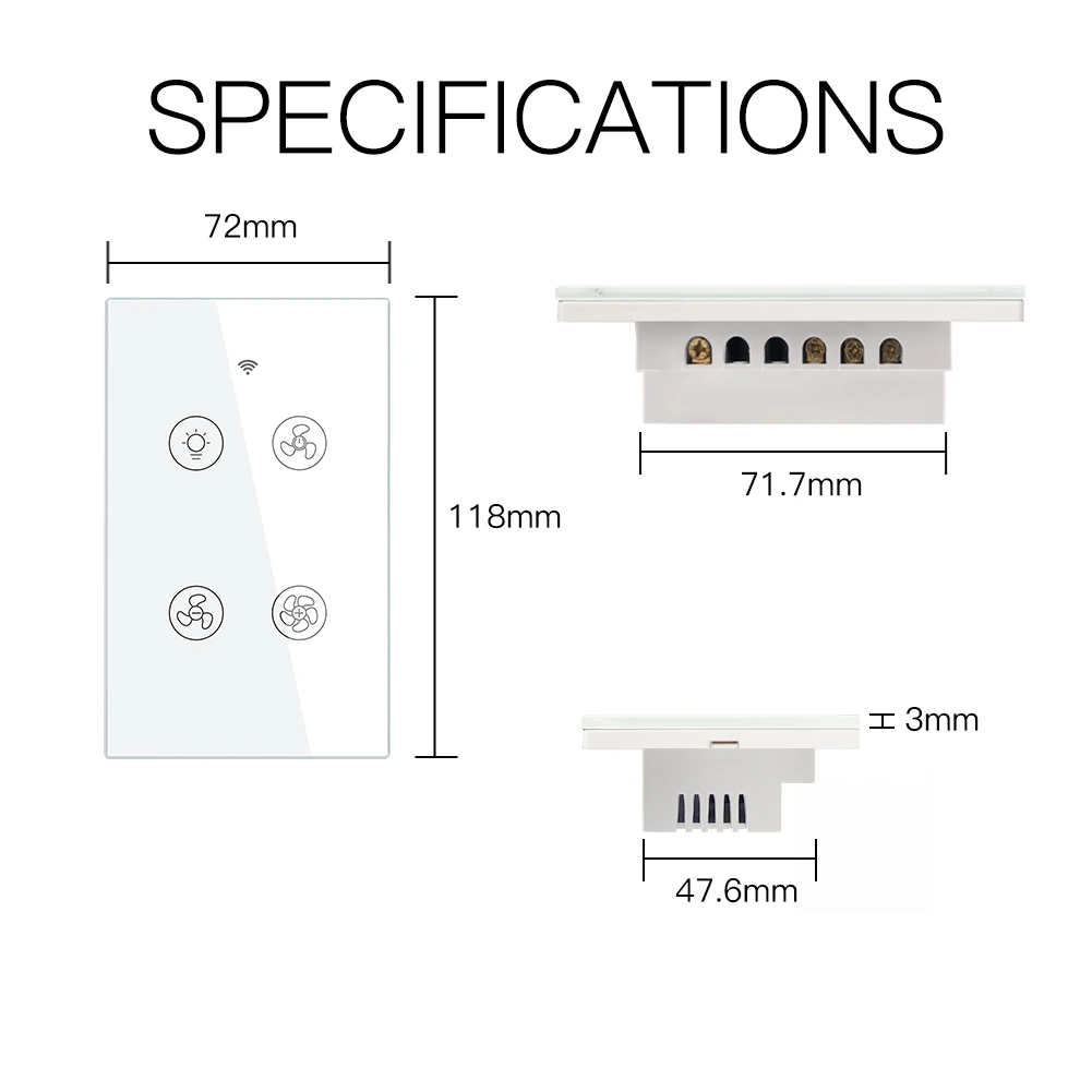 Умный вентилятор Moes Wi-FiСветильникПереключательМожет управлять вентилятором светильник отдельно в любое время из любого места,БеспроводнойLy через использованиеВаш существующий домСеть WiFi. Концентратор не требуется, более удобный и простой в использованииНепосредственно Замените традиционные переключатели. Мобильный телефонПриложение «Умная жизнь»Управление и сенсорное управление доступны.