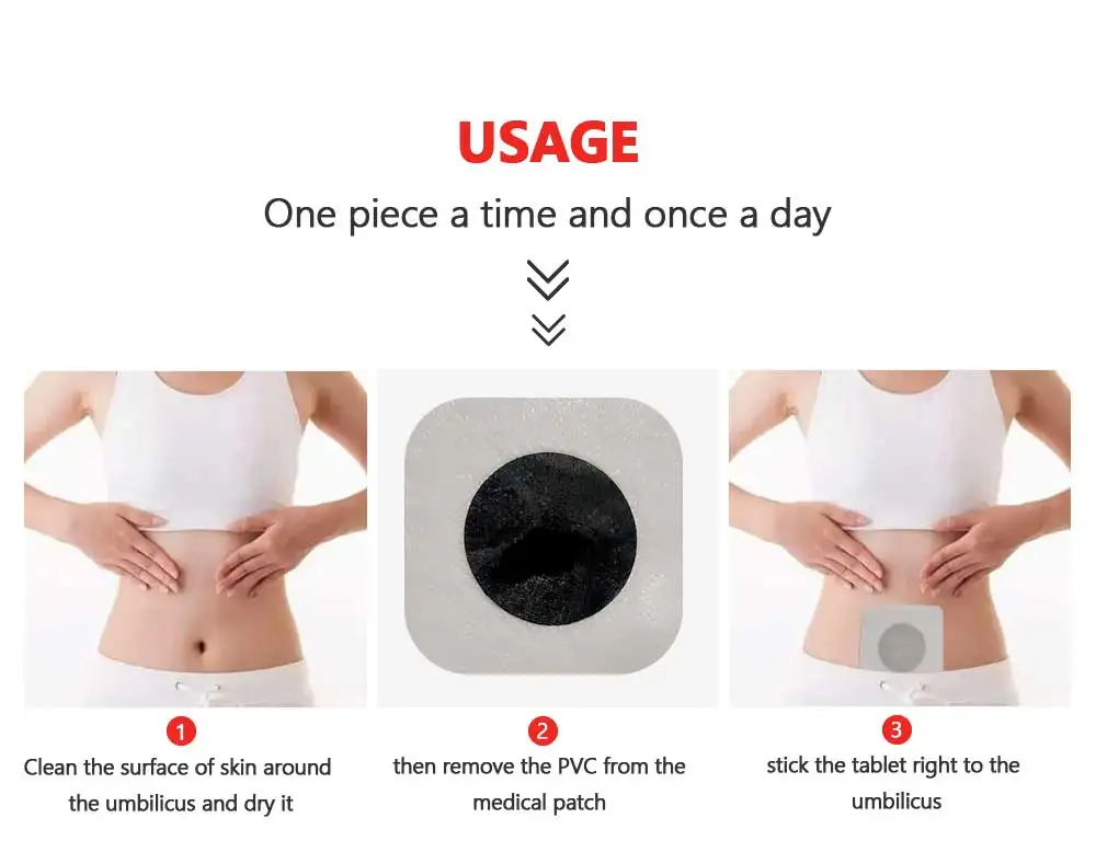 Нанесите пластырь на пупок.ОдинПатч держится 24 часа. Затем поменять на другой новый