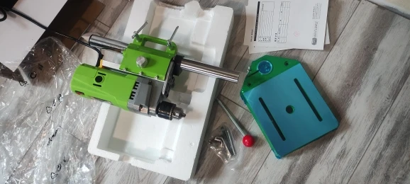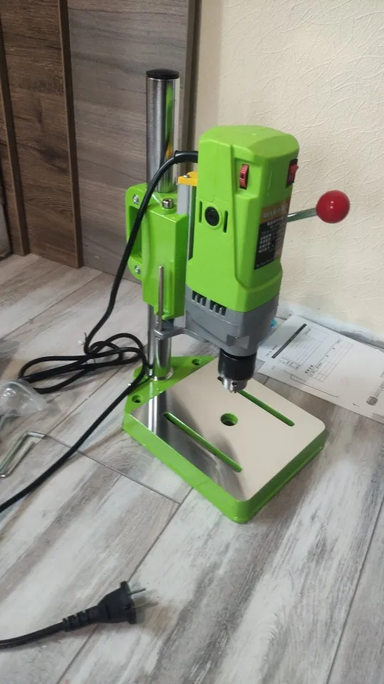 Дооставка курьером до двери за неделю, станок собрал легко, опора - хороший литой алюминий, включил в розетку, всё работает, в сверлении не проверял