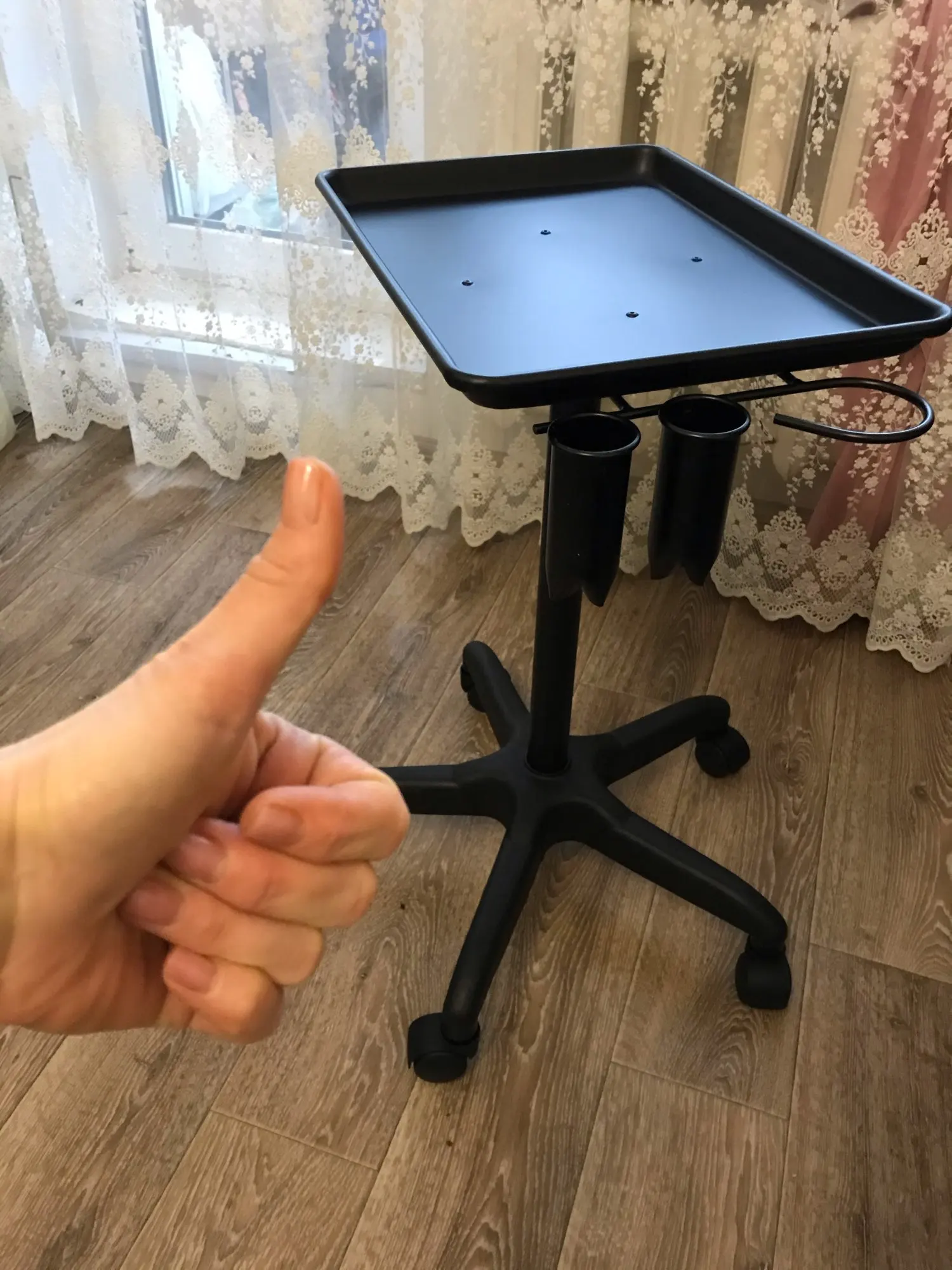 Наикрутейший столик на колёсах!!! Я в полном восторге!! Прибыл из России курьером прямо в руки, конструкция достойная. Материал стол и ножка метал, колеса и треножа пластик, но достаточно прочный. Сборка легкая, и понятная. Для работы Татуажа идеальный вариант. Спасибо продавцу.