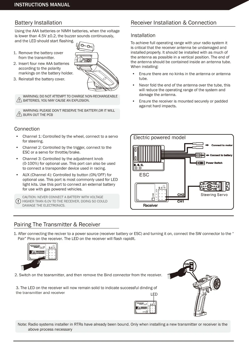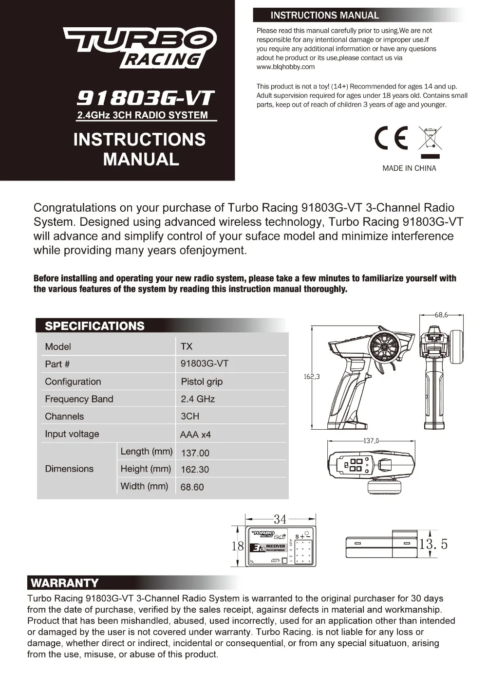 3-канальный передатчик дистанционного управления TURBO 91803G-VT, 2,4 ГГц (съемная ручка, приемник RX41 для радиоуправляемой машинки, лодки, PK TG3 FS-GT3B