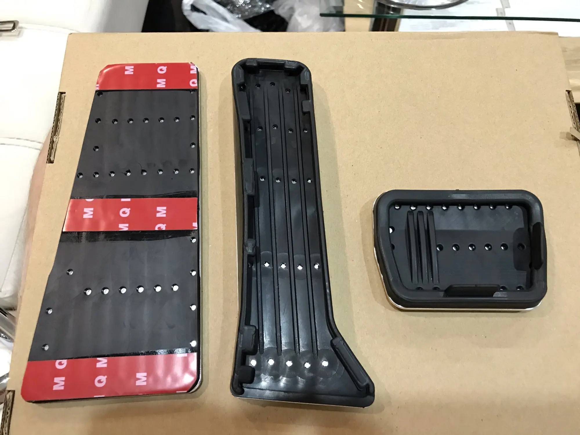 отличное качество! установилось без проблем. педаль тормоза - крепится вместо родной резины педаль газа - одевается поверх подставка слева - крепится на скотч на войлок, в принципе держит, но лучше на липучки посадить