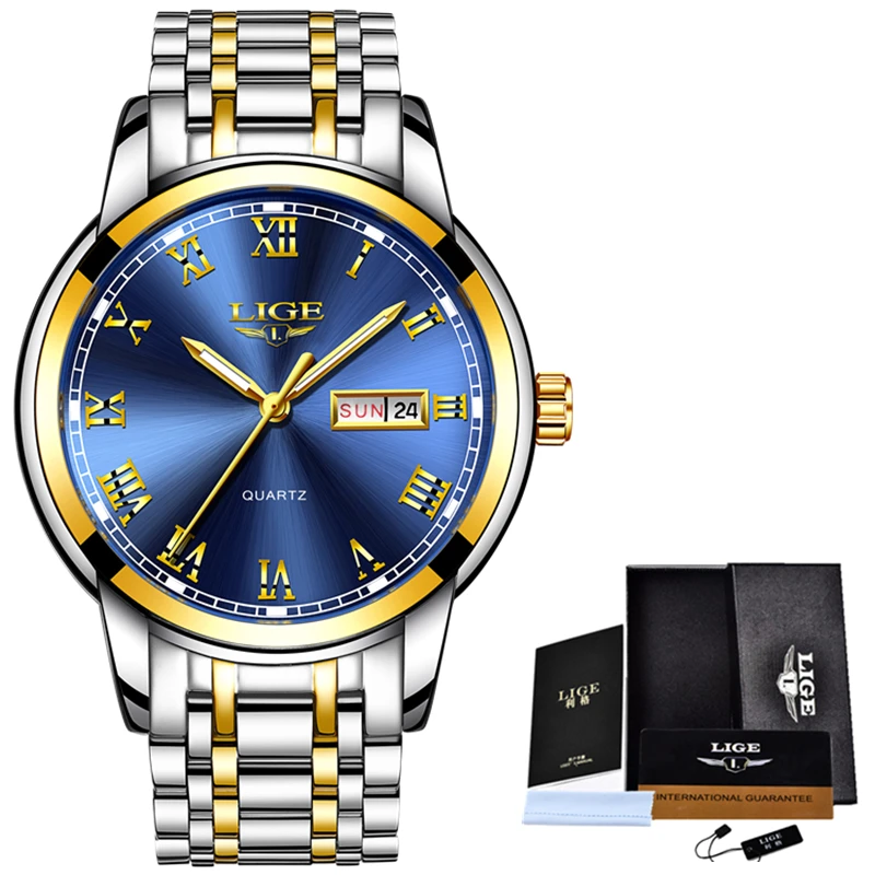 Часы наручные LIGE Мужские кварцевые, модные спортивные полностью стальные золотистые деловые брендовые Роскошные водонепроницаемые