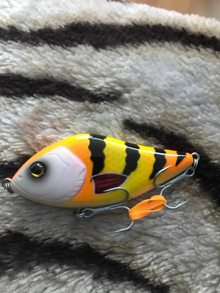 Шло 5 недель, трек отслеживался полностью, была объединена с другой посылкой. На вид хорош, петли проклеены. Крючки маловаты, на мой взгляд, достаточно острые, хотя, но по ногтю едут. Окраска своеобразная, бока отличаются друг от друга. На правом полосы не так чётко различимы, в другом претензий нет, всё ярко, детально. Глазки хорошо выполнены. Хорошая копия! Жаль товарищи не делают плавающих или суспендеров, хотя бы!☻ Буду потрошить и пытаться сделать плавающий вариант.